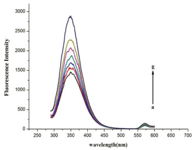 ![]() Figure 3.Fluorescence spectrum of buddleoside and BSA complex. The concentration of BSA was fixed at 2 µmol L-1, and the concentration of buddleoside changed from 0 to 20 µmol L-1 (a-g: 0, 6, 10, 14, 16, 18 and 20 µmol L-1)
