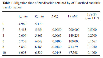 EXPERIMENTAL PART Instrument The ACE experiment was performed on a Beckman P/ACE MDQ system with a photodiode array detector. Data collection and analysis was done with Beckman 32 Karat software (version 7.0). An uncoated fused silica capillary (Yongnian reafine chromatograph, China) of 64.5 cm (54 cm of effective length) x 75 µm (i.d.) was used. The fluorescence spectroscopy experiments were performed by using the F-4600 type Fluorescence Spectrophotometer (Hitachi High-Technologies Co., Ltd., Tokyo, Japan). During the experiment, PHSJ-4A measuring instrument (Shanghai Precision & Scientific Instrument Co., Shanghai, China) was applied to determine different pH. Chemicals and solutions Buddleoside and BSA were purchased from Shanghai Yuanye Biotechnology Company (Shanghai, China) and Shanghai Aladdin Biotechnology Co., Ltd. (Shanghai, China), respectively. Both borax and boric acid were bought from Sigma (St. Louis, Missouri, USA). The other reagents used in the experiments were of analytical grade. The pH of the borate buffer containing 30 mmol L-1 borax was adjusted to 8.8 with 100 mmol L-1 boric acid. The 1 mmol L-1 buddleoside stock solution was prepared in DMSO and the 100 µmol L-1 BSA stock solution was dissolved in 30 mmol L-1 borate buffer. During the ACE, the sample solution was diluted to 100 µmol L-1 with borate buffer solution prior to each injection. DMSO was chosen to label EOF which is a cationic sheath formed on the inner wall of the capillary tube. EOF can drive the whole fluid in the capillary tube to the cathode. Experimental BSA solution (0-10 µmol L-1) was prepared by diluting BSA stock solution with borate buffer containing 0.05 mol L-1 glycine (Gly). During the fluorescence measurement, the BSA and NaCl concentrations were keeped at 2 µmol L-1 and 0.1 mol L-1 in 30 mmol L-1 borax buffer solution (pH=8.8), respectively. At the same time, the ratios of the concentration ratios of buddleoside to BSA were 0, 3, 5, 7, 8, 9 and 10, respectively. All solutions needed to be filtered through 0.22 µm filters and stored refrigerator at 4 ºC before experiments. Procedures New capillaries were rinsed with 1 mol L-1 NaOH for 5 min, washed with water for 10 min and conditioned with borax buffer for 15 min before use. To improve great peak shape and reproducibility, the capillary was rinsed sequentially for 3 min by NaOH, water and buffer. In the ACE analysis, analytes were detected at 334 nm and injected by applying a pressure of 0.5 psi for 5 s. The operating voltage was set to 15 kV. The electrophoresis was performed with 30 mmol L-1 borate buffer (pH 8.8, 0.05 mol L-1 Gly) including different concentrations of BSA (0-10 µmol L-1). In order to eliminate the effect of BSA adsorption on the inner wall of the capillary, Gly, an amphotericion, was added to compete with BSA. Besides, the BSA concentration was low (0 to 10 µmol L-1) in this study. In fluorescence experiments, 2 µmol L-1 BSA solution was titrated with different buddleoside concentrations (0, 6, 10, 14, 16, 18, 20 µmol L-1). Fluorescence spectra were recorded at 298 K and the scanning wavelength range was 290-600 nm. The excitation wavelength was set at 280 nm. Emission and excitation slits were 10 nm.