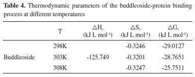 Analysis of interaction forces by ACE method Generally speaking, four forces including hydrogen bond, Van Der Waals force, electrostatic interaction and hydrophobic interaction are the main interactions between small molecules and proteins. The thermodynamic parameters such as entropy change(ΔS), enthalpy change (ΔH) and free energy change (ΔG) are of great significance for the determination of the binding mode of drugs and proteins. Equation 7, 8 and 9 are applied to calculate the thermodynamic constants of the binding process of buddleoside and BSA:31 ![]() where R and Ka are gas constants and binding constants at corresponding temperatures, respectively. In order to further elaborate the process of the combination of buddleoside and BSA, ACE method is used to study the thermodynamic parameters of the interaction process of buddleoside and BSA at 298, 303 and 308 K in this study. The data is shown in Table 4. The negative ΔG indicates that the interaction between buddleoside and BSA is spontaneous. The negative ΔS and ΔH are often used as evidence of Van Der Waals force.32 In the exothermic process or in the presence of hydrogen bonds, the phenomenon of ΔH less than zero can also be observed. When ΔS is greater than zero, it is often considered to have hydrophobic effect. In aqueous solution, when ΔS is greater than zero and ΔH is less than zero (close to zero), it indicates the generation of electrostatic interaction.33