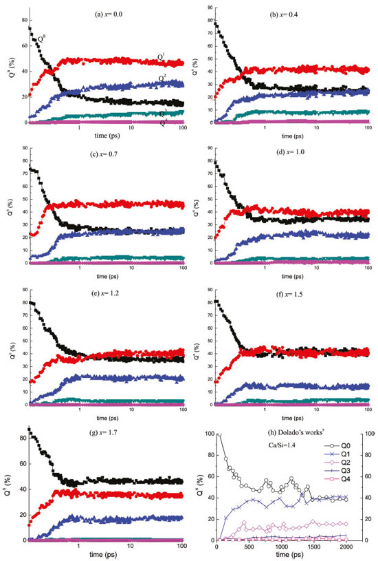 RESULTS AND DISCUSSION Polymerization of SiO4 chain and Qn The polymerization of SiO4 forming chain, which plays a critical role in cement hydration, is characterized by the Qn for the C-S-H models with different x value, the evolution of Qn has been shown in Figure 1.
