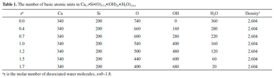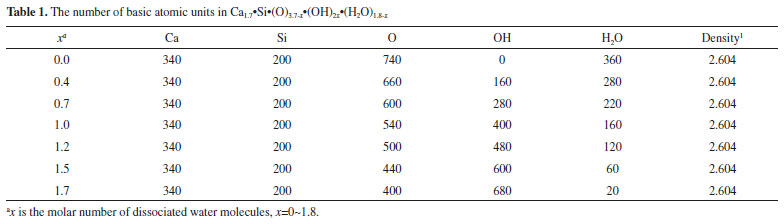 COMPUTATIONAL DETAILS Based on the basic atomic units including Ca, Si, O, OH, and H2O, the cubic models of Ca1.7Si(O)3.7-x(OH)2x(H2O)1.8-x (x represents the molar number of dissociated H2O molecules, x∈0~1.8, C/S=1.7, H/S=1.8 and a density of 2.604 g cm-3 in the reference)1 are constructed by using Monte-Carlo method in Materials Studio software.16 The detailed numbers of basic atomic units in C-S-H are shown in Table 1.