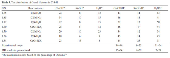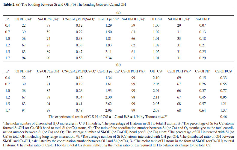 Bonding of OH with Si (or Ca) In order to investigate in detail the bonding of OH and Si (or Ca), their CN and proportions of various OH in C-S-H are shown in Table 2 (except for the C-S-H model at x=0). It can be seen from Table 2, the ratio of the CN between Si (or Ca) and Oh to the CN between Si (or Ca) and total O increases with the x (see column d). Therefore, the percentage of Si (or Ca) linking with OH gets bigger (see column c). Similarly, the number of Si-OH (or Ca-OH) bond increases with increasing x, and the average number increases from 1.29 to 2.34 per Si atom for Si-OH bond while it ranges from 1.34 to 2.96 per Ca atom for Ca-OH bond (see column e).