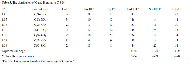 I. Department of Chemistry Biology & Environmental Engineering, Hunan Provincial Key Laboratory of Xiangnan Rare-Precious Metals Compounds and Applications, Xiangnan University, Chenzhou City, Hunan Province, People's Republic of China Recebido em 08/01/2020 *e-mail: youandi2008@163.com Determining the morphological distribution of hydrogen atoms in calcium silicate hydrate phase (C-S-H) is of great concern but challenging. In this work, based on the stoichiometric composition of (CaO)1.7(SiO2)(H2O)1.8, a series of amorphous Ca1.7Si(O)3.7‑x(OH)2x(H2O)1.8-x models are constructed using Monte Carlo method, where x represents the molar number of dissociated H2O molecules (x∈0~1.8). A molecular dynamics simulation has been performed with the ClayFF force field. The analysis of Qn, radial distribution function (RDF), coordinate number (CN), mean chain length (MCL), mean square displacement (MSD), elastic modulus (M), and Young's modulus (E) are used to explore the microstructure, hydrogen atom distribution and mechanical properties. The results demonstrate that the proportions of hydrogen atoms in Ca-OH, Si-OH, and H2O are about 26%~45%, 13%~22%, and 61%~33%, respectively. The calculated microstructure parameters and mechanical properties, especially for C-S-H models with x of 0.7~1.2, are in good agreement with those reported previously in theoretical and experimental works, indicative of the excellent rationality of our theoretical C-S-H models. The simulated results of this work provides a new strategy of constructing theoretical C-S-H model, which might be suitable for studying the doping behavior of metal oxides or metal salts in C-S-H. INTRODUCTION As the core component of cement gels, Calcium-Silicate-Hydrated (C-S-H) accounts for 60%~70% of the cement mass. The chemical composition of C-S-H can be expressed as (CaO)1.7(SiO2)(H2O)1.8, determined by small-angle neutron diffraction and x-ray diffraction techniques.1 At least three types of hydrogen atoms in C-S-H (i.e., free OH, confined OH and H2O) were characterized by two-dimensional NMR technology,2,3 but their proportions in C-S-H remain unclear. The coordination state between OH and Si (or Ca) atoms in C-S-H is also arguable. Some experimental studies demonstrated that the percentage of hydrogen bonding between SiO4 and SiO3-OH was 38.14%4 and the Si-OH bond appear in Q1 or the non-bridged oxygen of Q2.5 The Si-OH content decreases with the increase of the mole ratio of Ca atoms to Si atoms (C/S) in C-S-H.5 Si-OH bond disappears at high Ca/Si ratio (C/S>1.2), while Ca-OH bond start appearing at high C/S ratio (C/S>1.3).6,7 Computational study found that the Si-O.Ca bond might hydrolysis to form a Si-OH bond and a Ca-OH bond at C/S ratio of 1.3,8 and the number of Si-OH bonds per Si atom was about 0.25 and 0.1 when the C/S ratio equals to at 1.4 and 2.0, respectively.9 The molecular simulation technology provides a new method to explore the bonding state of hydrogen atoms in C-S-H on the atomic scale. It is critical and challenging to construct a resonable theoretical C-S-H model to perform theoretical simulations. In previous works, two C-S-H models were used to investigate the microstructure and mechanical properties of cement paste. One is sandwiched and layer-ordered C-S-H model based on Tobermorite/Calcium hydroxyl (T/CH) or Tobermorite/Jennite (T/J) crystal,10 the other is amorphous C-S-H model formed from the polymerization of Si(OH)4, Ca(OH)2 and H2O.9 The former has successfully elucidated the experimental results such as the mechanical properties of C-S-H and the effect of C/S ratio on mechanical properties, and has been proved to be suitable for studying the surface structure and the properties of C-S-H.11,12 However, the infinitely linked SiO4 tetrahedron chains in this C-S-H model are inconsistent with the fact that the dimers and pentamers are dominant in the actual cement gels. Pellenq et al.13 manually removed some SiO2 units from the T/CH models to match the experimental Qn distribution, the density and elastic modulus of C-S-H. Lack of universality is the main disadvantage of this method, which relies heavily on individual expertise and experience. Dolado et al.9 has used the latter model to simulate the formation process of C-S-H and hydrogen bonding that was observed in the experimental research, however, this theoretical work led to excessive mole ratio of water molecules to Si atoms (H/S), which influenced the polymerization of SiO4 tetrahedra and resulted in excessively high Q0 at C/S=2.0. As proved by previous works, theoretical study based on an ideal model without artificial modification was desirable for understanding the experimental results about the microstructure and mechanical properties of C-S-H. In this work, molecular dynamics simulation was performed on the basis of amorphous C-S-H models, which was derived from the random combination of some atomic units such as Ca, Si, O, OH, and H2O.9 During the molecular dynamics studies, ClayFF force field parameters14,15 were selected to simulate the geometry of the C-S-H model. The microstructure and mechanical properties were analyzed to elucidate the morphological distribution of hydrogen atoms in C-S-H.