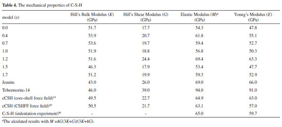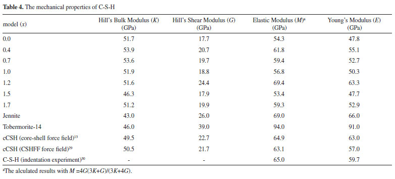 Based on the above discussion of the CN and charge balance between OH and Si (or Ca), it can be concluded that the C-S-H models of x =0.7~1.2 may completely reproduce the distribution of three types of OH in actual C-S-H. Mechanical properties of C-S-H The higher-order properties such as elastic constants (E) are often used to investigate the microstructure of materials. The calculated mechanical properties of C-S-H models are shown in Table 4.
