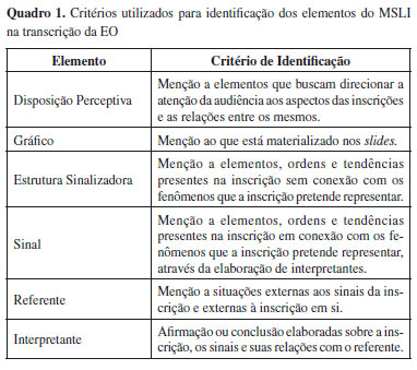 CONTEXTO DE APLICAÇÃO DA PROPOSTA E ANÁLISE DOS DADOS Com base nos objetivos descritos anteriormente, tomamos para avaliação, com base no MSLI, uma EO produzida por estudantes do primeiro ano do curso de Bacharelado em Química do Instituto de Química de São Carlos, da Universidade de São Paulo, enquanto matriculados na disciplina Comunicação e Expressão em Linguagem Científica II (CELCII), que tem por objetivo o desenvolvimento de habilidades comunicativas orais. No início do semestre, a turma foi dividida em grupos, e cada grupo recebeu um artigo, retirado desta Revista, para realização das seguintes atividades, com base no conteúdo do artigo: produção de uma EO prévia inicial pautada nas seções Introdução e Procedimento Experimental do artigo, produção de um pôster acadêmico, e de uma EO final abordando todo o conteúdo do artigo. A EO final, escolhida para ser avaliada neste trabalho, foi elaborada com base no artigo intitulado "Avaliação do teor de metais em sedimento do rio Betari no Parque Estadual Turístico do Alto Ribeira - PETAR, São Paulo, Brasil" de Cotta et al.13 O PETAR é uma unidade de conservação da Mata Atlântica, localizada no sul do estado de São Paulo. Desde um século atrás, as atividades no PETAR, assim como no Vale do Ribeira, têm afetado essa região, colocando-a em constante risco ecológico. A mineradora de Furnas fazia a extração, principalmente, de galena, pirita e esfalerita, produzindo 7000 a 8000 toneladas de chumbo, no período de 1919 a 1968. E, durante todo esse período, o material de rejeito era despejado no rio Furnas. Um dos objetivos do trabalho era avaliar a capacidade de troca catiônica (CTC) dos metais chumbo, cádmio, cobre, zinco, alumínio, crômio, ferro, manganês e zinco ao longo dos rios Furnas e Betari. Também foi avaliada a biodisponibilidade dos mesmos metais totais e pseudototais acumulados em sedimentos do rio. Os resultados encontrados foram concentrações pseudototais de cobre, zinco e chumbo, assim como, zinco e chumbo biodisponíveis, acima do valor máximo permitido. Para a avaliação, inicialmente, foi realizada uma caracterização da EO, identificando a quantidade e os tipos de inscrições utilizados, visando detectar padrões e tendências que poderiam ou não estar conectadas com o processo de produção de sentidos. Foi realizada em seguida a avaliação da transcrição da fala do aluno expositor da EO, que consiste em debulhar o mesmo a fim de encontrar os processos e elementos do MSLI. Com base no trabalho de Roth e Bowen4 e Keller,14 adotamos os critérios apresentados no Quadro 1 para a identificação de cada elemento do MSLI. Os resultados encontrados fornecem o entendimento de como se deu o processo de produção de sentidos e o encandeamento de geração de sinais, referentes e interpretantes a partir das inscrições apresentadas na EO.