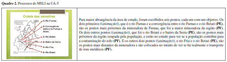 USO DO MODELO SEMIÓTICO DE LEITURAS DE INSCRIÇÕES NA ANÁLISE DE EXPOSIÇÕES ORAIS A respeito das características da EO produzida, essa continha 15 slides, os quais foram apresentados em 15 min por apenas um dos integrantes do grupo, em uma sequência esperada de Introdução, Procedimento Experimental, Resultados e Conclusões. Todos os slides possuíam alguma inscrição, sendo utilizadas, no total, 16 inscrições. No entanto, nem todas as inscrições foram lidas pelo aluno expositor, de forma que algumas inscrições apareciam apenas de maneira decorativa ou ilustrativa. É possível estabelecer uma relação entre os tipos de inscrições presentes no artigo de Cotta et al.13 e os tipos de inscrições presentes na EO. No artigo, são encontrados tabelas, gráficos, equação e mapa, ou seja, inscrições, em sua maioria, próximas ao MCT. Os tipos de inscrições presentes na EO não se limitam aos tipos presentes no artigo, e se distribuem por todo o continuum (Figura 1), devido à presença de fotografias, ícones e esquemas (inscrições próximas do MFO). As inscrições utilizadas na EO se distribuíram entre três temáticas principais: quatro inscrições relacionadas ao Contexto da Pesquisa (CP), sete inscrições relacionadas com os Procedimentos Experimentais (PE) e cinco inscrições relacionadas aos Resultados (R). As inscrições com a temática CP são aquelas inseridas na primeira parte da EO e têm a função principal de apresentar à audiência o contexto local da pesquisa, o PETAR e a problemática em estudo. Nessa temática estão presentes três fotografias e um desenho icônico. As inscrições com a temática PE aparecem no meio da apresentação e têm como função demonstrar o procedimento experimental, desde os pontos de coleta até os aparelhos utilizados para quantificação dos metais. Nessa temática estão presentes um mapa, dois esquemas, uma fotografia, um ícone, um fluxograma e uma equação. As inscrições que pertencem à temática R são três tabelas, um gráfico e uma fotografia. Nota-se que no início da apresentação predominam inscrições próximas ao MFO, e à medida que a apresentação se encaminha para o final ocorre a predominância de inscrições próximas ao MCT. Isso ocorre devido às características do gênero EO. Segundo Pozzer e Roth,15 dentro da ciência há preferência pela utilização de inscrições do lado direito do continuum (Figura 1), ou seja, inscrições próximas ao MCT. Já nos textos didáticos, usam-se predominantemente fotografias e desenhos icônicos. A EO, no contexto da sala de aula e da comunicação científica, se configura como um gênero que carrega perspectivas do discurso didático e do científico. Portanto, é notável, durante o início da apresentação, quando o estudante está realizando uma introdução, o uso de inscrições tais como fotografias e desenhos icônicos, ou seja, inscrições próximas ao MFO, já que seu discurso apresenta características mais didáticas. Quando o estudante se direciona para exposição dos procedimentos e resultados, o seu discurso ganha caráter predominantemente científico, e as inscrições recorrentes nessa etapa são tabelas, equações e gráficos, inscrições mais generalizadas, próximas do MCT. Dessa forma, a EO pode proporcionar para o aluno expositor e para a audiência a expansão do contato com inscrições de diferentes naturezas, o que fomenta o desenvolvimento das habilidades comunicativas com inscrições e a capacidade de articular várias formas de representação. Presença de Elementos do MSLI Como relatado anteriormente, nem todas as inscrições foram lidas efetivamente pelo aluno expositor. Um total de 50% das inscrições aparecia apenas de maneira decorativa (18%) ou ilustrativa (32%). As inscrições decorativas foram assim classificadas devido ao aluno expositor não as citar em sua fala. Já com relação às inscrições ilustrativas, ele meramente nomeava o que era possível nelas visualizar, sem ressaltar nenhum detalhe ou conectá-las com o seu discurso posterior ou anterior. Dessa forma, devido à ausência de um discurso que nos permitisse buscar e identificar elementos do MSLI, a leitura e produção de sentidos dessas inscrições não foram avaliadas. As inscrições que sofreram um processo de leitura que permitia análise da produção de sentidos com o MSLI, são aqui denominadas de inscrições complementares, que são aquelas que deram suporte e estavam altamente associadas à fala do aluno expositor, sendo elaboradas, descritas, explicadas e classificadas pelo mesmo, proporcionando à audiência diversos recursos semióticos para a elaboração de sentidos. De maneira reflexiva, entende-se que a fala elabora a inscrição e a inscrição também elabora a fala do estudante. Ou seja, existe uma relação de motivação, tanto do texto verbal oral para com a inscrição, quanto da inscrição para com o texto verbal. Na EO aqui avaliada, as inscrições complementares se constituem de um esquema, um mapa, um gráfico, três tabelas e uma equação, presentes nas temáticas PE e R. A seguir, aspectos da leitura e da produção de sentidos dessas inscrições serão elucidadas à luz do MSLI. MSLI em Mapa O Quadro 2 apresenta a transcrição e a identificação dos processos do MSLI na leitura do único mapa presente na EO. Os trechos seguidos de (PE) são aqueles em que predominam o processo de estruturação e os trechos seguidos de (PF) são aqueles em que predominam o processo de fundamentação.