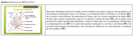 O Quadro 2 traz a UA-5, a qual contém um mapa para demonstrar os pontos de coleta de amostras ao longo dos rios Furnas e Betari. O aluno expositor inicia sua fala enunciando que havia seis pontos de amostragem, para em seguida salientar e caracterizar cada um deles, relacionando suas localizações com motivações de estudo. A ordem de estruturação dos pontos é guiada pelo texto escrito presente no slide, sendo possível identificar ambos os processos de estruturação e de fundamentação do MSLI. As características inerentes a cada um deles serão discutidas a seguir. No trecho inicial, "Os dois primeiros ((animação)), que é o rio Furnas e a convergência entre o rio Furnas e o rio Betari", predomina um processo de estruturação, e é possível assim classificá-lo devido à presença de momentos em que o estudante ilustra elementos gráficos e estruturas sinalizadoras da inscrição em sua fala. Inicialmente, os pontos de amostragem são destacados no fragmento "Os dois primeiros", em que o aluno se refere aos pontos de coleta um e dois. Esse trecho representa o momento em que o estudante elabora os pontos citados como estruturas sinalizadoras, já que ele está salientando estruturas no mapa que posteriormente poderão se tornar um sinal. Apesar de agrupar dois pontos no fragmento de fala, o aluno expositor fez uso de animações, para que cada ponto fosse salientado e estruturado individualmente, e assim criar uma significação adequada do que cada ponto representa. O movimento de animação se dá pelo surgimento de uma flecha que liga cada ponto no mapa ao texto escrito referente no slide. Com base no MSLI, a utilização desse recurso semiótico retrata um momento em que o estudante está salientando estruturas sinalizadoras durante o processo de estruturação. Por ser uma inscrição, a seta animada e o seu sentido na EO também pode ser elucidado com base no MSLI. Como o aluno não cita a animação em sua fala, podemos inferir que o processo de estruturação da seta foi ausente, possivelmente influenciado pela alta familiaridade do aluno expositor, assim como da audiência, com esse tipo de representação. O trecho "Os dois primeiros, que é o rio Furnas e a convergência entre o rio Furnas e o rio Betari" serve como um interpretante para a seta, ou seja, o aluno expositor verbaliza apenas o processo de fundamentação. O uso desse recurso evidencia ainda a manifestação da habilidade de aplicar recursos semióticos para auxiliar na produção de sentidos, a qual se configura também como uma adequação na inscrição para sua introdução no contexto da EO e deve ser valorizada. Por fim, os fragmentos "o rio Furnas" e "a convergências entre o rio Furnas e o rio Betari" representam, cada um, indicações ao texto materializado no corpo do slide, ou seja, a presença do elemento gráfico na leitura do estudante. Os processos de estruturação dos demais pontos de amostragem são semelhantes aos dois primeiros. Os trechos "Os dois outros pontos" (referente aos pontos três e quatro) e "E os outros dois pontos" (referente aos pontos cinco e seis), assim como as animações correspondentes, representam momentos em que o estudante está salientando os quatro pontos de coleta como estruturas sinalizadoras. Já os trechos "o rio Betari", "o bairro da Serra", "o rio Fria" e "o rio Betari", em relação aos pontos três, quatro, cinco e seis, respectivamente, são indicações do texto incorporado no slide, ou seja, nesse momento o estudante está ilustrando elementos gráficos. O processo de estruturação é importante nesse momento da EO, visto que os pontos de amostragem e o local físico que eles representam influenciam a discussão dos resultados encontrados posteriormente. Após a estruturação, o estudante começa a conectar as estruturas sinalizadoras destacadas com referentes e interpretantes, por meio de processos de fundamentação, associando-os à situação física local do PETAR e justificando sua presença no estudo. Utiliza-se como exemplo o trecho "são os pontos mais próximos da região ocupada pela população, e estão no estudo para ver se a população contribui para a contaminação do solo", no qual é possível identificar a predominância do processo de fundamentação devido à identificação dos elementos característicos do mesmo. O fragmento "são os pontos" indica um momento em que o estudante transpõe as estruturas sinalizadoras destacadas no processo de estruturação (pontos três e quatro) para o processo de fundamentação, transformando-as em sinais. Ao indicar que os pontos estão na "região ocupada pela população", o aluno expositor está elaborando um elemento referente, já que está citando uma situação física atribuída aos sinais "pontos três e quatro". A partir disso, o fragmento "e estão no estudo para ver se a população contribui para a contaminação do solo" representa a elaboração de um interpretante, que fortalece a relação entre os sinais e o referente. Cabe aqui um questionamento: como o estudante sabia que aquela região era a ocupada pela população? De onde surgiram o referente e o interpretante identificados? Mapas são inscrições que, apesar da sua perspectiva bidimensional, possuem bastante semelhança com a região que representam. Dependendo do propósito para que foi construído, um mapa pode ainda carregar demarcações que auxiliam o leitor na percepção e identificação de aspectos que, sem esses recursos, dificilmente seriam percebidos. A natureza dessas demarcações é variada, podendo ser símbolos, e o que eles representam é explicitado em legenda que acompanha a inscrição. O mapa utilizado na UA-5 (Figura 5) possui uma legenda para auxiliar a interpretação dos sinais nela demarcados. Segundo a legenda, o símbolo "■" representa regiões do PETAR com ocupação humana. Entende-se, portanto, que o referente "região ocupada pela população" surge a partir da leitura da