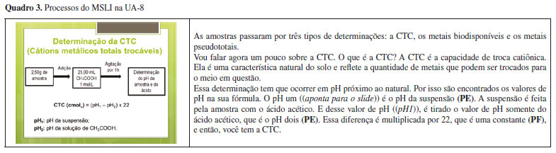 Um exemplo de interpretante em relação ao símbolo ■ que o aluno expositor poderia ter falado seria "no mapa, o símbolo ■ representa a região ocupada pela população". A partir disso, com este sinal estruturado e fundamentado, o estudante poderia utilizar essa informação durante a elaboração de outros sinais, referentes e interpretantes, ou seja, realizar uma transferência do referente "região ocupada pela população" do sinal "■" para os sinais "ponto 3" e "ponto 4", o que de fato ocorreu, mas não de maneira explícita no processo de leitura. Na fala do aluno expositor, apenas parte dessa última etapa foi identificada, o que revela a existência de processos de apropriação e familiarização do aluno expositor com os símbolos do mapa, de maneira que a distinção entre o objeto e o que representa o objeto é feita de maneira instintiva, porém sem comprometer o processo de produção de sentidos. Tal familiaridade advém do trabalho com o mapa em outras etapas da disciplina CELCII, como a EO inicial, a construção do pôster e o estudo da estrutura e retórica da linguagem científica do artigo. Foi possível identificar mais dois processos de fundamentação na UA-5, representados nos trechos "são os pontos mais próximos da mineradora de Furnas, que foi a maior mineradora da região" (pontos um e dois) e "são os pontos mais distantes da mineradora e são colocados no intuito de ver se há realmente o transporte de íons metálicos" (pontos cinco e seis). De forma semelhante ao que foi mencionado anteriormente, quando o estudante enuncia "são os pontos", ele está transportando as estruturas sinalizadoras destacadas no processo de estruturação para o processo de fundamentação, transformando-as em sinais. Os fragmentos "mais próximos da mineradora de Furnas" e "mais distantes da mineradora" representam a associação dos sinais (pontos um e dois, e pontos cinco e seis, respectivamente) a um referente, que é a localização física dos pontos. Por fim, o fragmento "são colocados no intuito de ver se há realmente o transporte de íons metálicos" representa a elaboração de um interpretante que relaciona os pontos cinco e seis, com seu referente. As informações elaboradas durante o processo de estruturação servem para estabilizar o mapa no conhecimento do mundo físico dos estudantes, assim como criar uma melhor visualização da região investigada e como suas características poderiam influenciar nos resultados da pesquisa. MSLI em Equações O Quadro 3 mostra a UA-8, com duas inscrições: um fluxograma, que apresenta uma das etapas experimentais para cálculo da CTC, a qual é calculada por uma equação, que é a outra inscrição presente no slide. No entanto, o estudante aparentemente deixa o fluxograma de lado e se detém na explicação da equação, sendo identificados processos do MSLI na leitura referente a ela.