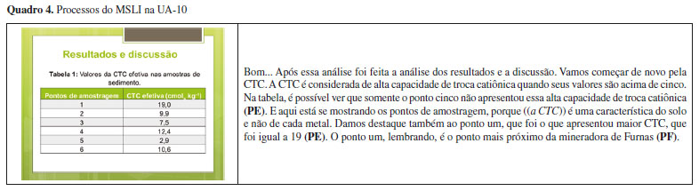 Durante o transporte da equação do artigo para o slide, o aluno expositor cometeu um erro conceitual. A fórmula apresentada no slide não é utilizada para calcular a CTC, mas a capacidade de metais trocáveis, que, quando somada à acidez trocável, dá o valor da CTC. O aluno expositor inicia a leitura engajado em um movimento reverso, de redução de uma situação física para uma inscrição, evidenciado no trecho "Essa determinação tem que ocorrer em pH próximo ao natural (referente). Por isso são encontrados os valores de pH na sua fórmula (sinal)", no qual, a partir de características externas à equação, há projeção de sinais que devem ser encontrados na mesma. Esse fragmento, além de reafirmar a equação como uma matriz de sinais, chama a atenção da audiência e a prepara para a elaboração dos sinais e dos interpretantes, a seguir. A partir da identificação dos elementos do MSLI, é perceptível a predominância de processos de estruturação no restante da leitura. O trecho "O pH um ((aponta para o slide)) é o pH da suspensão" conta com a menção a dois elementos gráficos da inscrição, representados nos fragmentos "O pH um" e "o pH da suspensão", que são textos materializados no corpo do slide. No momento em que o estudante aponta para o slide, está salientando a estrutura "pH1" da equação como uma estrutura sinalizadora. O fragmento "o pH da suspensão" também representa um referente para a estrutura destacada. O trecho seguinte "A suspensão é feita pela amostra com o ácido acético" representa a elaboração de um interpretante para o fluxograma presente no slide, o qual apresenta as etapas de preparo da solução. No trecho seguinte: "E desse valor de pH ((pH1)) é tirado o valor de pH somente do ácido acético, que é o pH dois", ao retomar a estrutura "pH1", podemos entender que essa se transformou em um sinal, e agora é utilizada para dar continuidade à explicação, conectando-a com o resto da equação, enquanto ilustram-se demais elementos do MSLI. Podemos ainda identificar os fragmentos "o pH dois" e "pH somente do ácido acético" como elaboração de elementos gráficos, materializados no slide. O último fragmento também representa um referente para a estrutura "pH2" da equação. Roth et al.2 afirmam que quando a familiaridade de um leitor com os referentes, os sinais e as regras de convenção de uma inscrição se tornam bastante significativas, a relação entre o leitor e o sinal não requer mais atenção do leitor. Um exemplo, é a do aluno expositor com os sinais matemáticos "-" e "x" da equação. Estes são sinais com os quais os estudantes estão em constante contato. Ou seja, a familiaridade com esses sinais é de tamanha extensão, que eles se tornam praticamente invisíveis e, ao vê-los, não se enxerga mais um traço ou um xis, mas o processo de subtração ou multiplicação, respectivamente. Com isso, o aluno expositor apenas elabora o interpretante "é tirado" para o sinal "-" na equação, sem precisar estruturá-lo para a audiência. Esse processo ocorre sem perda de sentido para a audiência, visto que a mesma possui a familiaridade necessária para tal. No último trecho da UA-8, predomina o processo de fundamentação. Em "Essa diferença é multiplicada por 22, que é uma constante, e então você tem a CTC" foram identificados os três elementos do processo de fundamentação. A partir do fragmento "é tirado", o estudante elabora o sinal "diferença", conectando-o a um novo interpretante "é multiplicada por", interpretante este advindo da familiaridade com os sinais matemáticos. A menção ao número "22" corresponde ao elemento gráfico do processo de estruturação. O fragmento "que é uma constante" representa a conexão do elemento gráfico com um referente, que define o que o número representa fisicamente. Situações em que o estudante tem alta familiaridade com a inscrição, seus sinais, ou seus referentes podem ser bastante recorrentes durante a leitura de inscrições em uma EO. No entanto, se a audiência não apresentar a mesma familiaridade, esse tipo de leitura não é bem-vinda, pois pode acarretar subtração de informações, já que o sentido é elaborado, mas a sua origem na inscrição não. O aluno expositor não pode esperar que a audiência enxergue os mesmos sinais que ele durante a leitura de uma inscrição, assim é necessário chamar atenção a esses sinais, estruturá-los e conectá-los com referentes adequados, ou seja, guiar adequadamente a audiência no processo de significação. MSLI em Tabelas O Quadro 4 traz a UA-10, que contém a primeira tabela da EO, que apresenta os resultados obtidos para a avaliação da CTC nas amostras de sedimentos. A leitura de uma tabela deve ser feita considerando a sua estrutura em linhas e colunas, no sentindo de cruzar informações presentes nesses espaços e compará-las. Assim, é preciso observar as linhas e colunas como estruturas sinalizadoras, e nelas procurar outros aspectos que possam ser ligados a algum referente externo a partir da elaboração de interpretantes. Como os pontos de amostragens já haviam sido estruturados anteriormente, na UA-5 (Quadro 2), as informações advindas dessa etapa são utilizadas pelo aluno expositor para justificar aspectos elucidados durante a leitura da inscrição na UA-10.