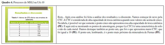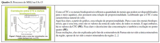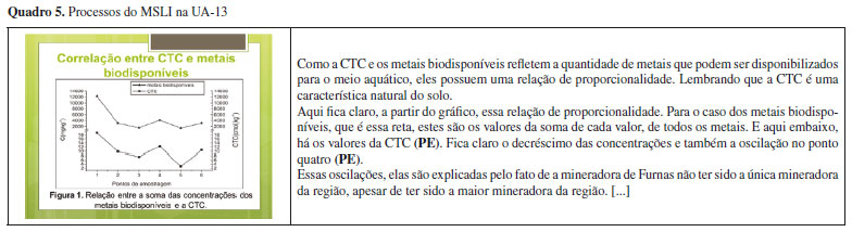 A UA-13, no Quadro 5, apresenta a relação de proporcionalidade que existe entre os metais biodisponíveis e a CTC. O estudante inicia apresentando essa afirmação, e então, no trecho "Aqui fica claro, a partir do gráfico, essa relação de proporcionalidade", toma o gráfico em sua totalidade como um sinal da proporcionalidade entre a CTC e a concentração de metais biodisponíveis, que é o referente, ou situação física retratada na inscrição. O estudante tenta demostrar como o gráfico clarifica a relação de proporcionalidade entre a CTC e a concentração de metais biodisponíveis no sedimento, assim pronunciando: "Para o caso dos metais biodisponíveis, que é essa reta, estes são os valores da soma de cada valor, de todos os metais. E aqui embaixo, há os valores da CTC". O processo do MSLI predominante nesse trecho é o de estruturação. A leitura do gráfico começa pela sua legenda interna, enumerando um elemento gráfico, identificado no fragmento "Para o caso dos metais biodisponíveis", que são palavras materializadas na legenda. Em seguida, no fragmento "que é essa reta", o estudante toma como estrutura sinalizadora a curva que representa os metais biodisponíveis, de acordo com a legenda. A segunda curva do gráfico também foi salientada como uma estrutura sinalizadora, no fragmento "E aqui embaixo". Cada uma das curvas foi associada a um referente, nos trechos "soma de cada valor, de todos os metais" e "há os valores da CTC", que é o que cada uma daquelas estruturas sinalizadoras, enquanto sinais, representam: as concentrações dos metais biodisponíveis e a CTC, respectivamente. Essa leitura, no entanto, não foi suficiente para clarificar a relação pretendida, e será comentada com mais detalhes na seção "MSLI: Potencialidades e Limitações". Por fim, temos o trecho "Fica claro o decréscimo das concentrações e também a oscilação no ponto quatro". Nesse trecho, o estudante está associando o gráfico com uma tabela da UA-11, criando uma representação da diminuição da concentração ao longo do percurso do rio, juntamente com a oscilação, sobre a qual ele falou naquela unidade. O processo de estruturação também é predominante, com a identificação dos elementos gráficos no fragmento "ponto quatro" e disposição perceptiva no trecho "Fica claro". Ao serem elucidados, tais elementos auxiliam a audiência na verificação, pela inscrição, de que a concentração diminuía seguindo o percurso do rio, mas que também ocorria uma oscilação em determinado ponto. O decréscimo e a oscilação, ilustrados no fragmento, são assim representações do elemento referente, ou seja, a situação física que o gráfico está tratando.
