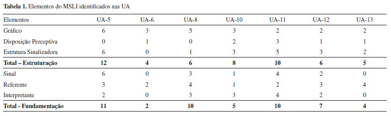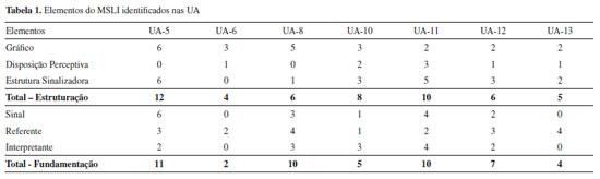 MODELO SEMIÓTICO DE LEITURA DE INSCRIÇÕES: POTENCIALIDADES E LIMITAÇÕES A Tabela 1 resume a quantificação de elementos dos processos do MSLI, identificadas em cada UA, inclusive daquelas que não foram discutidas no texto (UA-6, UA-11 e UA-12). As linhas sombreadas foram obtidas a partir das somas dos resultados acima delas. Dessa forma, "Total - Estruturação" é a soma dos elementos gráfico, disposição perceptiva e estrutura sinalizadora, encontrados naquela UA, e "Total - Fundamentação" é a soma dos elementos sinal, referente e interpretante, encontrados naquela UA. É importante ressaltar que a inserção da Tabela 1 nesse momento não objetiva realizar a quantificação de aspectos qualitativos relatados na seção anterior, mas sim deixar mais clara a discussão acerca das potencialidades e limitações do MSLI.