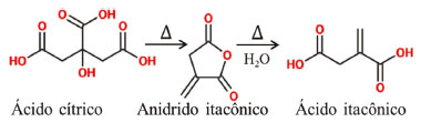 Inicialmente, o AI foi sintetizado por Baup, em 1837, a partir da termodecomposição do ácido cítrico, transformado-o em anidrido itacônico, seguida pela hidrólise do anidrido (Figura 3).3,19 O processo químico se mostrou ineficiente e economicamente inviável do ponto de vista industrial sendo substituído por rotas biotecnológicas.