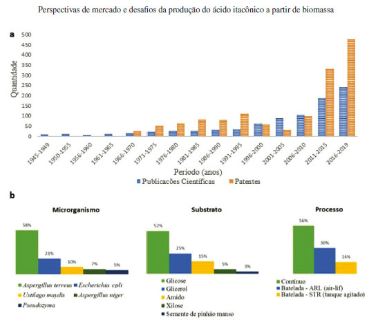 Posteriormente, em 1932, Kinoshita apresentou a síntese biológica do AI empregando o fungo osmofílico Aspergillus itaconicus. Em 1939, Calam, Oxford & Raistrick utilizaram o A. terreus e verificaram uma maior capacidade de produção do que o A. itaconicus.19-21 Em 1945, Lockwood e Ward realizaram testes com 308 cepas e identificaram o A. terreus NRRL 1960 como uma alternativa promissora.22 O interesse crescente por sustentabilidade, conservação ambiental, recursos renováveis e menores custos associados ao consumo de energia, a partir dos anos 80, levou ao desenvolvimento da fermentação descontínua e contínua avançadas, empregando tecnologias e estratégias de desenvolvimento de bioprocessos para melhorar a produção de AI.23 Considerando a possibilidade de se trabalhar com diferentes fungos, de modo a aumentar o rendimento da etapa fermentativa, foram testados o Aspergillus itaconicus, fungos filamentosos, como o Ustilago maydis,24,25 além de estirpes mutantes de Candida.26 Apesar da grande variedade de microrganismos, atualmente, o Aspergillus terreus, utilizando glicose ou melaço pré-tratado como substrato, tem sido o mais eficiente nos processos industriais de produção do AI.27,28 Potencial de mercado do ácido itacônico Estima-se que o mercado do ácido itacônico em 2020 seja equivalente a US$ 96 milhões, tendo como projeção US$116,6 milhões até 2026, com taxa de crescimento anual composta (CAGR) de 2,8% (2021-2026).29 As fabricações de polímeros, como o MMA, formado a partir da reação de descarboxilação; látex sintético (SBR), pela copolimerização com estireno e butadieno; e resina de poliéster insaturado (UPR), através da poliesterificação, são suas principais aplicações. O AI pode substituir outros ácidos insaturados e anidridos, tais como os ácidos acrílico, maleico, fumárico, metacrílico e seus derivados.30 A produção e o consumo estão concentrados na China, Japão, Coreia, Austrália, Inglaterra, Alemanha, Rússia, Itália, EUA, Canadá e México.31 Os países asiáticos representam o maior mercado e competitividade mundial. Os países europeus apresentam um crescimento lento, devido a regulações governamentais. Os EUA são o segundo maior mercado, após a China, com incremento no desenvolvimento de novas tecnologias no setor industrial, em particular, nos segmentos de detergentes; látex sintético, usado em pneus; e MMA, que é utilizado em revestimentos, plásticos transparentes e adesivos.32 As principais empresas produtoras de AI são a Itaconix Corporation, Qingdao Langyatai Group Co., Ltd., Zhejiang Guoguang Biochemistry Co., Ltd., Jinan Huaming Biochemistry Co. Ltd., Iwata Chemical Co., Ltd., Alpha Chemika e Shandong Kaison Biochemical Co.33 O custo de produção (entre 1,7 a 2,0 US$ kg-1) é o principal fator que dificulta a ampliação do seu mercado,34 pois, atualmente, é mais elevado do que o de seus similares, como o anidrido maleico. Para ser competitivo com commodities análogas, o custo com a fermentação do AI precisa alcançar US$ 0,5 kg-1.35 Atualmente, o AI já é competitivo com o ácido acrílico e pode, em futuro próximo, substituir o anidrido maleico e o ácido fumárico com melhorias nas tecnologias de fermentação e uso de processos de separação, tais como a adsorção, na etapa de purificação.30,34 Levantamento de patentes e artigos sobre o ácido itacônico A análise do desenvolvimento das rotas tecnológicas para a produção do AI, ao longo dos anos, foi baseada na coleta de dados de patentes (1963-2019) e artigos (1945-2019). A ferramenta utilizada para a seleção dos artigos científicos foi a Web Of Science (www.webofscience). As patentes foram obtidas através da base de dados Derwent Innovations Index (www.derwentinnovationsindex.com). Os bancos de dados retornaram com 1.412 depósitos de patentes (1963-2019) e 879 publicações científicas (1945-2019). Conforme pode ser observado na Figura 4a, a partir do período 2006-2010, verificou-se um aumento mais significativo do número de patentes e artigos científicos publicados. Esse fato pode estar relacionado ao interesse na busca de processos tecnológicos envolvendo fontes renováveis para produção do AI, como molécula plataforma, em substituição a obtenção de produtos de origem fósseis.