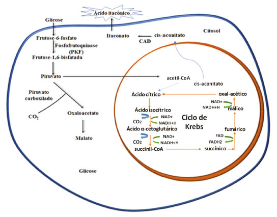![]() Figura 5. Esquema da via metabólica para a biossíntese do ácido itacônico. Adaptado da ref. 22