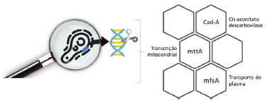 Verifica-se que há diversos microrganismos sendo testados em laboratório para a produção do AI. Cada um apresenta vantagens e desvantagens que devem ser consideradas na análise do melhor sistema a ser usado, visando aplicação em uma planta industrial. Dentre os microrganismos utilizados no processo de biossíntese do AI, destacam-se o Ustilago maydis, a Escherichia coli, a Pseudozyma antarctica, o Aspergillus niger e o Aspergillus terreus. O A. terreus é o microrganismo mais utilizado e possui boa resistência a impurezas.42 Sua produtividade depende fortemente da aeração no biorreator, uma vez que as células do fungo crescem na forma de pellets que formam uma barreira de transferência de massa no biorreator, prejudicando a difusão do oxigênio do ar.19 Esse problema pode ser minimizado com a injeção de ar enriquecido com oxigênio no sistema. A partir de modificações genéticas e uso de diferentes substratos durante a etapa fermentativa, foram obtidos diversos resultados que variam em uma larga faixa de produção de AI. Verifica-se uma tentativa de potencializar a etapa fermentativa utilizando o Aspergillus terreus, através de modificações genéticas, a exemplo da superexpressão dos principais genes relacionados - cadA (cis-aconitato descarboxilase), mttA (fator de determinação da transcrição mitocondrial) e mfsA (transporte de plasma) -, que influenciam diretamente na concentração de AI (Figura 6).14,36