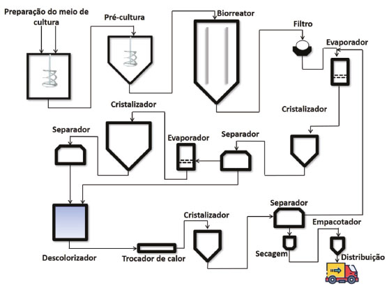 ![]() Figura 7. Diagrama esquemático do processo de produção do ácido itacônico. Adaptado da ref. 22