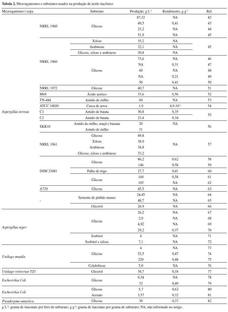 I. Departamento de Engenharia Química, Universidade Federal da Bahia, 40210-630 Salvador - BA, Brasil Recebido em 11/02/2020 *e-mail: uolpontes@uol.com.br Itaconic acid (IA) is a very promising platform molecule due to the possibility of it being used to obtain products such as methyl methacrylate and synthetic latex, with the prospect that its global market will grow at an average annual rate of 2.8% (CAGR) from 2021 to 2026, exceeding US$ 116.6 million in sales. The main technological route used to obtain itaconic acid is fermentation using different strains of Aspergillus terreus fungi. The main advancements are related to genetic engineering, as Aspergillus terreus is the most tolerant of the microorganisms employed in the process synthesis and optimization. The main substrate used is glucose (52%), followed by glycerol (25%). Among the results presented in this paper, the best production was achieved using Ustilago maydis, with 220 g L-1 of IA, yielding 0.33 g g-1, using glucose as a carbon source. Moreover, it is necessary to continue optimizing the biological process of IA production, since it is a platform molecule with major economic potential. INTRODUÇÃO O uso de fontes renováveis é de fundamental importância para um desenvolvimento econômico com foco na sustentabilidade. Verifica-se a necessidade de inovações para atender às demandas da sociedade, que tem exigido materiais ecologicamente corretos, com garantia da mesma qualidade dos produtos já utilizados. A biomassa apresenta um grande potencial para produzir, de forma sustentável, vários polímeros e químicos verdes, bem como combustíveis, substituindo os produtos de origem fóssil.1,2 Os resíduos de biomassa são fontes de açúcar de baixo custo, quando comparados aos produtos de origem petroquímica não renovável.3,4 A biomassa lignocelulósica é um exemplo de matéria-prima com esse potencial, sendo constituída majoritariamente por três polímeros: celulose (hexose), hemicelulose (pentose), lignina e,5 em menores quantidades, extrativos e cinzas.5 Esses componentes estão organizados na parede celular de modo que as fibras de celulose se encontram altamente ramificadas e envolvidas com a matriz amorfa de lignina e hemicelulose, conferindo resistência ao acesso de enzimas/microrganismos (Figura 1).6-8