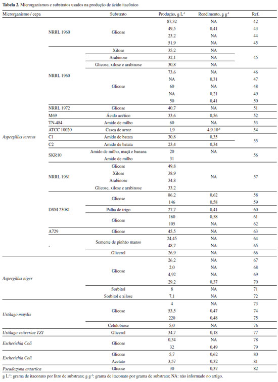 REFERÊNCIAS 1. Bafana, R.; Pandey, R. A.; Crit. Rev. Biotechnol. 2017, 38, 68. 2. Galembeck, F.; Barbosa, C. A. S.; Souza, R. A.; Quim. Nova 2009, 32, 571. 3. Teleky, B.-E.; Vodnar, D. C.; Polymers 2019, 11, 1035. 4. Ferreira, V. F.; Silva, F. C.; Quim. Nova 2013, 36, 1514. 5. Vaz Júnior, S.; Soares, I. P.; Ferreira, P. G.; Quim. Nova 2014, 37, 709. 6. Luo, Y.; Zheng, L.; Xiaoling, L.; Xiaofeng, L.; Fan, J.; Clark, J. H.; Hu, C.; Catal. Today 2019, 319, 14. 7. Moura, H. O. M. A.; Campos, L. M. A.; Da Silva, V. L.; De Andrade, J. C. F.; De Assumpção, S. M. N.; Pontes, L. A. M.; Carvalho, L. S.; Cellulose 2018, 25, 5669. 8. Guerra, G. N.; Albuquerque, E. C. M. C; Campos, L. M. A.; Pontes, L. A. M.; J. Nat. Fibers 2019, 16, 1. 9. Rodrigues, J. A. R.; Quim. Nova 2011, 34, 1242. 10. Werpy, T.; Petersen, G.; Department of Energy, Energy Efficiency and Renewable Energy: Washington, DC, USA, 2004; Volume I 2004. 11. Hedge, K.; Prabhu, A.; Sarma, S. J., Brar, S. K.; Dasu, V. V. Em Platform Chemical Biorefinery: Future Green Chemistry, Brar, S. K.; Sarma, S. J.; Pakshirajan, K., eds.; Elsevier: Amsterdam, 2016, cap. 10. 12. Nieder-Heitmann, M.; Haigh, K. F.; Görgens, J. F.; Bioresour. Technol. 2018, 262, 159. 13. Magalhães Júnior, A. I.; De Carvalho, J. C.; Medina, J. D. C.; Soccol, C. R.; Appl. Microbiol. Biotechnol. 2016, 101, 1. 14. Saha, B. C.; J. Ind. Microbiol. Biotechnol. 2017, 44, 303. 15. El-Imam, A. A.; Du, C.; J. Biodivers. Biopros. Dev. 2014, 1, 119. 16. Regestein, L.; Klement, T.; Grande, P.; Kreyenschulte, D.; Heyman, B.; Maβmann, T.; Eggert, A.; Sengpiel, R.; Wang, Y.; Wierckx, N.; Blank, L. M.; Spiess, A.; Leitner, W.; Bolm, C.; Wessling, M.; Jupke, A.; Rosenbaum, M.; Büchs, J.; Biotechnol. Biofuels 2018, 11, 279. 17. Hejian, H.; Yusoff, M. W.; Curr. Res. J. Biol. Sci. 2015, 2, 37. 18. Klement, T.; Milker, S.; Jäger, G.; Grande, P. M.; Domínguez, M. P.; Bünches, J.; Microb. Cell Fact. 2012, 11, 43. 19. Kuenz, A.; Krull, S.; Appl. Microbiol. Biotechnol. 2018, 102, 3901. 20. Willke, T.; Vorlop, KD.; Appl. Microbiol. Biotechnol. 2001, 56, 289. 21. Klement, T.; Büchs, J.; Bioresour. Technol. 2013, 135, 422. 22. Cruz, J. C.; Castro, A. M.; Camporese Sérvulo, E. F.; 3 Biotech. 2018, 8, 138. 23. Jing Y.; Hao Xu, J. J.; Jiang, J.; Zhang, N.; Xie, J.; Wei, M.; Zhao, J.; J. Bioresour. Bioprod. 2019, 4, 135. 24. Wierckx, N.; Agrimi, G.; Lübeck, P. S.; Steiger, M. G.; Mira, N. P.; Punt, P. J.; Environ. Biotechnol. 2020, 62, 153. 25. Voll, A.; Klement, T.; Gerhards, G.; Buechs, J.; Marquardt, W.; Chem. Eng. Trans. 2012, 27, 367. 26. Trivedi, J.; Bhonsle, A. K.; Atray, N. Refining Biomass Residues for Sustainable Energy and Bioproducts 2020. 27. Kirimura, K.; Yoshioka, I.; Compr. Biotechnol. 2011, 3, 166. 28. Troiano, D.; Orsat, V.; Dumont, M. J.; Renewable Sustainable Energy Rev. 2020, 117, 109472. 29. https://www.wrcbtv.com/story/41571213/itaconic-acid-market-trend-2020-by-manufactures-types-applications-regions-and-forecast-to-2026, acessada em junho de 2020. 30. Carvalho, J.C.; Magalhães, A.; Soccol, C.; Chim. Oggi 2018, 36, 56. 31. https://markets.businessinsider.com/news/stocks/global-itaconic-acid-ia-industry-1029119853, acessada em junho de 2020. 32. https://www.openpr.com/news/1910970/exhaustive-study-on-itaconic-acid-market-2020-strategic, acessada em junho de 2020. 33. https://www.reportsanddata.com/report-detail/itaconic-acid-market, acessada em junho de 2020. 34. Magalhães, A. I. J.; Carvalho, J. C.; Thoms, J. F.; Medina, J. D. C.; Soccol, C. R.; J. Cleaner Prod. 2019, 206, 336. 35. Huang, X.; Chen, M.; Lu, X.; Li, Y.; Li, X.; Li, J. J.; Microb. Cell Fact. 2014, 13, 108. 36. Zhao, M.; Lu, X.; Zong, H.; Li, J.; Zhuge, B. I.; Biotechnol. Lett. 2018, 40, 455. 37. Karaffa, L.; Kubicek, C. P.; Appl. Microbiol. Biotechnol. 2019, 103, 2889. 38. Cordes, T.; Lucas, A.; Divakaruni, A. S.; Murphy, A. N.; Cabrales, P.; Metallo, C. M.; Mol. Metab. 2020, 32, 122. 39. Martínez-Reynes, I.; Chandel, N. S.; Nat. Commun. 2020, 11, 102. 40. Ryan, D. G.; O'Neill, L. A. J.; Annu. Rev. Immunol. 2020, 38, 289. 41. Boruta, T.; Bizukojc, M.; World J. Microbiol. Biotechnol. 2017, 33, 34. 42. Komáromy, P.; Bakonyi, P.; Kucska, A.; Tóth, G.; Gubicza, L.; Bélafi-Bakó, K.; Nemestóthy, N.; Fermentation 2019, 5, 31. 43. Nelson, G. E. N.; Traufler, D. H.; Kelley, S. E.; Lockwood, L. B.; Ind. Eng. Chem. 1952, 44, 1166. 44. Larsen, H.; Eimhjellen, K. E.; Biochem. J. 1955, 6217, 135. 45. Saha, B. C.; Kennedy, G. J.; J. Microbiol. Methods 2018, 144, 53. 46. Molnár, Á. P.; Németh, Z.; Kolláth, I.S.; Fekete, E.; Flipphi, M.; Ág, N.; Soós, Á.; Kovács, B.; Sándor, E.; Kubicek, C. P.; Karaffa, L.; Appl. Microbiol. Biotechnol. 2018, 102, 8799. 47. Nemestóthy, N.; Bakonyi, P.; Komáromy, P.; Bélafi-Bakó, K.; Biotechnol. Lett. 2019, 41, 1383. 48. Pfeifer, V. P.; Vojnovich. C.; Heger, E. N.; Ind. Eng. Chem. 1952, 44, 2975. 49. Songserm, P.; Thitiprasert, S.; Tolieng, V.; Piluk, J.; Tanasupawat, S.; Assabumrungrat, S.; Yang, S-T.; Karnchanatat, A.; Thongchul, N.; Appl. Microbiol. Biotechnol. 2015, 177, 595. 50. Karrafa, L.; Díaz, R.; Papp, B.; Fekete, E.; Sándor, E.; Kubicek, C. P. A.; Appl. Microbiol. Biotechnol. 2015, 99, 7937. 51. Saha, B. C.; Kennedy, G. J.; Biocatal. Agric. Biotechnol. 2019, 18, 101016. 52. Liu, Y.; Liu, G.; Zhang, J.; Balan, V.; Bao, J.; Biomass Conv. Bioref. 2020, 10, 463. 53. Yahiro, K.; Shibata, S.; Jia, S.; Park, Y. Okabe, M.; J. Ferment. Bioeng. 1997, 84, 375. 54. Pedroso, G. B.; Montipó, S.; Mario, D. A. N.; Alves, S. H.; Martins, A. F.; Biomass Convers. Biorefin. 2017, 7, 23. 55. Bafana, R.; Sivanesan, S.; Pandey, R. A.; Indian J. Microbiol. 2017, 57, 322. 56. Reddy, C. S. K.; Singh, R. P.; Bioresour. Technol. 2002, 85, 69. 57. Saha, B. C.; Kennedy, G. J.; Qureshi, N.; Bowman, M. J.; Biotechnol. Prog. 2017, 33, 1059. 58. Kuenz, A.; Gallenmüller, Y.; Willke, T.; Vorlop, K.-D.; Appl. Microbiol. Biotechnol. 2012, 96, 1209. 59. Hevekerl, A.; Kuenz, A.; Vorlop, K. D.