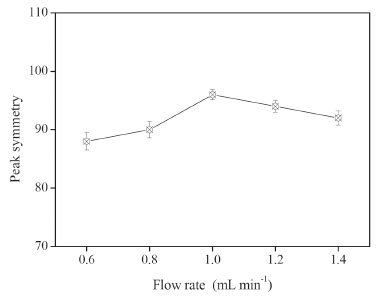 RESULTS AND DISCUSSION Optimized liquid chromatography conditions Choice of Mobile Phase: This is why bubbles in the mobile phase can interfere with separation, cause baseline drift, peak changes, and deviations in detection, so the mobile phase was ultrasonically degassed for 30 minutes. The effects of two different flow rates relative to chromatographic peaks and the response strength of NH4H2PO4-NaH2PO4 and KH2PO4-NaH2PO4 were compared. When using KH2PO4-NaH2PO4 as the mobile phase, the baseline was stable, the peak symmetry was good, and the target compound obtained a higher response value, so KH2PO4-NaH2PO4 was selected as the mobile phase. Choice of Mobile Phase pH: A PRP-X100 anion exchange column was used, which has a wide pH range from 1 to 13. The pH value of the mobile phase was very important for separation of target compound. Samples were extracted with 0.15 mol L-1 nitric acid, and the pH of the extracted sample solution was around 2. The effect of the mobile phase pH (3, 4, 5, 6, 7, 8) on the analysis results was optimized. The optimal pH was adjusted 6. Choice of Flow Rate: The flow rate of mobile phase have significant influences on the symmetry of arsenic species signal peak as well as the recovery of four arsenic species and then finally affects the accuracy of final result. Flow rates of 0.6, 0.8, 1.0, 1.2, and 1.4 mL min-1 were used to examine their effect on the peak shape and response intensity of the four arsenic speciation. The relationship between the flow rate of mobile phase and the symmetry of arsenic speciation signal peak (KH2PO4-NaH2PO4, pH = 6.0, isocratic elution) are shown in Figure 1. As can be observed, the optimal flow rate was determined to be 1.0 mL min-1.