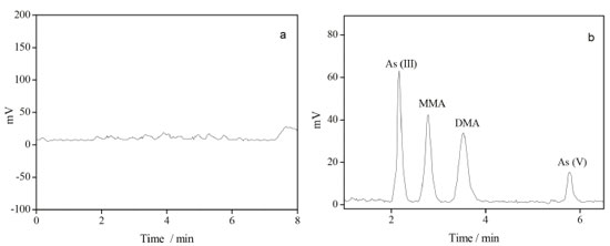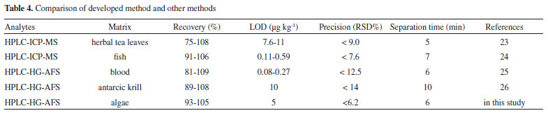 Comparison of the proposed method with others Listed in Table 4 are the experimental results of HPLC-ICP-MS,23,24 HPLC-HG-AFS,25,26 and the proposed method. In comparison with those reported methods for the separation and determination of arsenic species, the proposed method has some advantages in higher precision, more accuracy, and shorter separation time.