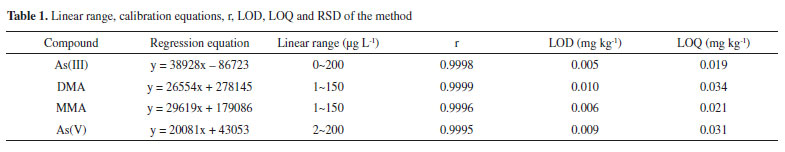 Linear relationship and detection limit The standard stock solution of four arsenic speciation was diluted using 0.15 mol L-1 nitric acid solution. The standard working solution with concentrations of 0, 2, 5, 8, 10, 15, 30, 50, 100, 150, and 200 µg L-1 were obtained. Using the optimal conditions, the concentration corresponding to the arsenic response value was used to obtain the standard equation with good linear relationship and low detection limit. (Table 1).