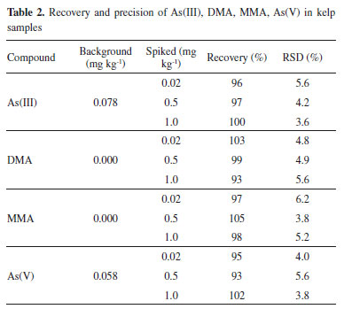 Precision and accuracy of the method To estimate the precision and accuracy of the proposed method, kelp samples was analyzed with spiked concentration levels of 0.02, 0.5 and 1.0 mg kg-1, respectively. Under the optimized conditions established above, the recovery and relative standard deviation of arsenic were calculated and listed in Table 2. The recovery rate was measured to be between 93-105%, and the precision was between 3.6% and 6.2%. This shows that this method can be applied to analyze and detect arsenic in algae samples.