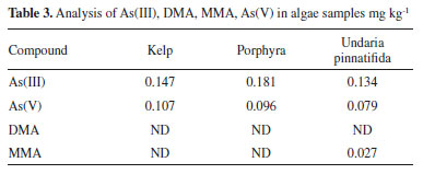 CONCLUSION To evidence the performance of the present method applicable to the detection of four arsenic species in algae samples were analyzed with the proposed procedure. After the nitric acid extraction as described above in the section of sample preparation, these samples were subjected to LC-HG-AFS analyses under the optimized liquid chromatography and atomic fluorescence conditions. The four arsenic speciation were separated and determined within 6 minutes. This method has a simple operation, in higher precision, stable data collection, and shorter separation time, and can be applied to analyze and study arsenic species in algae samples.