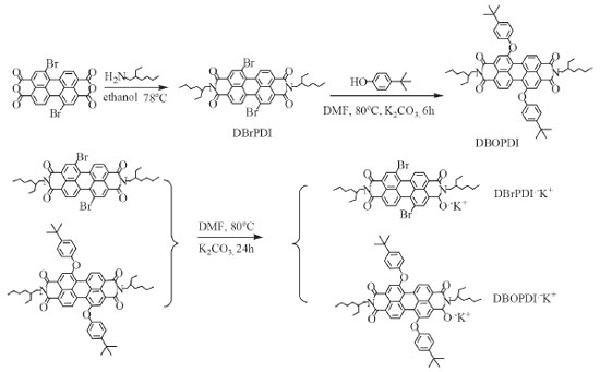 EXPERIMENTAL Material Materials: All reactions were carried out under an argon atmosphere. All reagents from commercial sources were used without further purification unless otherwise stated. Dimethyl Formamide (DMF) was fractionally distilled under reduced pressure. Characterization Infrared measurement with the KBr pellet technique was performed within the 400-4000 cm-1 on a Perkin Elemer SP100 Fourier transform infrared spectrometer. UV-Vis spectra were measured by Perkin Elemer Lambda 35. Cyclic voltammetry measurements were performed in solution, under argon atmosphere with a computer controlled CHI600E electrochemical workstation in a three electrode single- compartment cell using platinum electrodes and Ag/AgCl electrode as reference electrode, with Fc/Fc* redox couple as internal standard, with a tetrabutyl-ammonium hexafluoro-phosphate (Bu4NPF6) solution (0.1 mol L-1) in DMF at a scan rate of 0.1 V s-1. Synthesis of materials N,N'-diethylhexyl-1,7-di (p-tertbutylphenoxyl) perylene diimide (DBOPDI) and N,N'-diethylhexyl-1,7-dibromo- perylene diimide (DBrPDI) were synthesized in our group.16 DBOPDI radical anion salt A mixture of N,N'-diethylhexyl-1,7-di (p-tertbutylphenoxyl) perylene diimide (DBOPDI) (0.46 g, 0.5 mmol, 1 eq.) and DMF (17 mL) first undergone stirring on a magnetic stirrer thermostat for 10 min at room temperature. Then add potassium carbonate ( 2 eq.) as a catalyst and the temperature was adjusted to 85 ºC and kept for 24 h. After the reaction, the solvent was removed by rotary evaporation. The solid residue was thoroughly washed with enough water and then was vacuum-dried at 80 ºC for 24 h. Then, the crude product was dissolved in eluent [V (petroleum ether): V (THF) = 3:1] and purified by column chromatography on silica 200-300 to afford the DBOPDI radical anion salt (0.224 g, 0.24 mmol, yield: 48.7%). FT-IR(KBr), υ: 2960 cm-1, 2933 cm-1, 2871 cm-1, 1730 cm‑1, 1697 cm-1, 1656 cm‑1, 1595 cm-1, 1506 cm-1, 1461 cm-1, 1284 cm‑1,1122 cm-1,1074 cm-1. UV-vis: λmax: 700 nm and 757 nm. EPR: 338.22 G and 338.85 G. DBrPDI radical anion salt A mixture of N,N'-diethylhexyl-1,7-dibromo- perylene diimide (DBrPDI) (0.385 g, 0.50 mmol, 1 eq.) and DMF (17 mL) first undergone stirring on a magnetic stirrer thermostat for 10 min at room temperature. Then add potassium carbonate (2 eq.) as a catalyst and the temperature was adjusted to 85 ºC and kept for 24 h. After the reaction, the solvent was removed by rotary evaporation. The solid residue was thoroughly washed with enough water and then was vacuum-dried at 80 ºC for 24h. Then, the crude product was dissolved in eluent [V (petroleum ether): V (THF)= 3:1] and purified by column chromatography on silica 200-300 to afford the DFPDI radical anion salt (0.488 g, 0.302 mmol, yield: 60.5%). FT-IR(KBr), υ: 2956 cm-1, 2927 cm-1, 2858 cm-1, 1720 cm-1, 1697 cm-1, 1656 cm-1, 1585 cm-1, 1460 cm-1, 1434 cm-1, 1402 cm-1, 1332 cm-1, 1244 cm-1, 1186 cm-1. UV-vis: λmax: 705 nm and 766 nm. EPR: 339.12 G and 339.71 G.