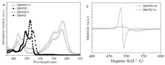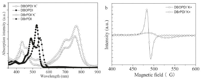 ![]() Figure 1. a: UV-vis spectra of DBrPDI, DBrPDI.-k+, DBOPDI and DBOPDI.-k+ in DMF; b: EPR of DBOPDI.-k+ and DBrPDI.-k+