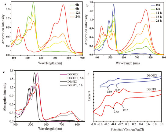 ![]() Figure 2. UV-vis spectra of DBOPDI and DBrPDI with the different reaction time in DMF, (a) DBOPDI (b) DBrPDI; (c) A comparison of absorption spectra with the same reaction time in DMF; (d) Cycle voltammograms of DBOPDI and DBrPDI recorded in DMF containing 0.1 M n-Bu4NPF6 at 0.1 V s-1