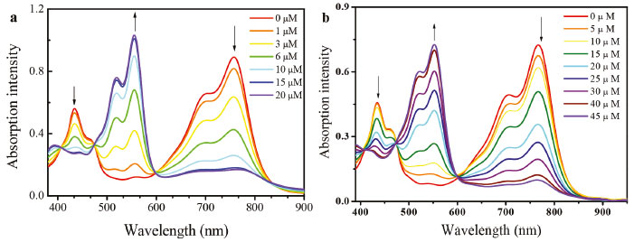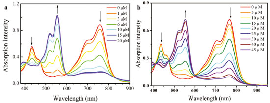 ![]() Figure 3. UV-vis spectra titration of PDIs radica anion salt with different concentration of Cu2+, (a: DBOPDI.-k+; b: DBrPDI.- k+ )