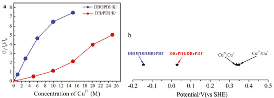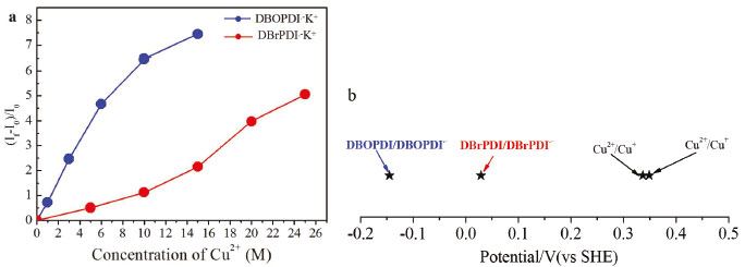 Effects of bay-substituents on selectivity of Cu2+ Cu2+ to the optical sensibility of DBOPDI.-k+ and DBrPDI.-k+ were discussed by (If-I0)/I0 vs concentration of Cu2+ (here: I0: intensity before adding Cu2+; If: intensity after adding Cu2+; 555 nm), as is showed in Figure 4a. Cu2+ to optical sensibility of DBOPDI.-k+was significantly higher than that of DBrPDI.-k+. Here, a more likely explanation for this phenomenon is that redox reactions occurred between PDIs radical anion and Cu2+. PDIs radical anion was oxidized to corresponding neutral PDIs and Cu2+ was reduced to Cu+ or Cu. The similar reaction has been reported by Screttas CG based on chemical reaction between the magnesium chloride and sodium naphthalene radical anion.19 Therefore, Cu2+ to the optical sensibility of DBOPDI.-k+ and DBrPDI.-k+that the reaction rate between PDIs radical anion and Cu2+ depend on the difference between the PDI/PDI.- and Cu2+/cu+ or Cu2+/cu0 (Figure 4b). Clearly, DBOPDI radical anion with Cu2+ has a higher reaction rate compared to that of the DBrPDI radical anion.