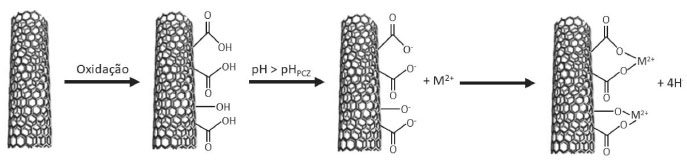 ![]() Figura 1. Mecanismo de sorção das espécies metálicas divalentes na superfície dos nanotubos de carbono oxidados em valores de pH>pHPCZ. Adaptado da Ref. 1