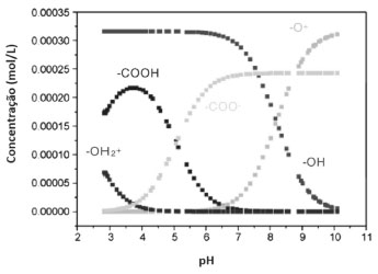 ![]() Figura 2. Distribuição de grupos funcionais contendo oxigênio na superfície dos nanotubos de carbono em função da variação do pH. Adaptado da Ref. 19