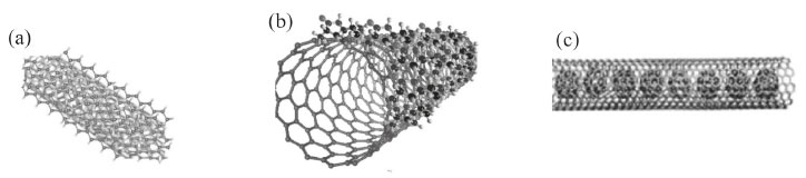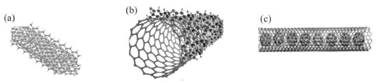 ![]() Figura 3. Esquema de funcionalização dos nanotubos de carbono usando métodos não-covalentes: (a) acondicionamento de polímeros (b) sorção de surfactante (c) átomos ou moléculas aprisionadas na cavidade interna dos nanotubos. Adaptado da Ref. 105