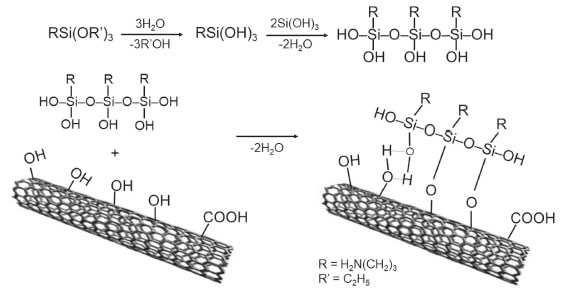 ![]() Figura 4. Esquema das reações de silanização na superfície de nanotubo de carbono. Adaptado da Ref. 152