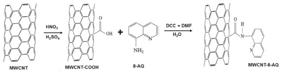 ![]() Figura 5. Imobilização do agente quelante 8-aminoquinolina na superfície de nanotubos de carbono Adaptado da Ref. 157