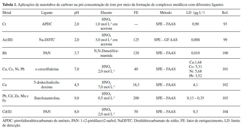 Aplicação de nanotubos de carbono modificados fisicamente Os métodos de modificação de nanotubos de carbono com agentes oxidantes permitem aumentar a dispersão do nanomaterial em meio aquoso por meio da inserção de grupos funcionais na superfície, úteis na pré-concentração de íons metálicos. Porém, nesse tipo de abordagem, um grande número de defeitos é inevitavelmente gerado nas paredes laterais dos nanotubos de carbono, especialmente quando a reação ocorre na presença de radiação ultrassônica. Ainda, em alguns casos mais extremos, os nanotubos de carbono podem ser fragmentados. Esses efeitos prejudiciais resultam em diminuição das propriedades mecânicas, bem como na ruptura do sistema de elétrons π dos nanotubos de carbono, responsáveis pelo transporte de elétrons e pela condução térmica. O uso de ácidos concentrados e fortes agentes oxidantes, usados na funcionalização química, caracteriza uma prática ambientalmente hostil. Outro aspecto que deve ser mencionado refere-se que ao maior grau de agregação dos filamentos de nanotubos de carbono após a oxidação, o que reduz a área superficial do material. Assim, um grande esforço tem sido feito para desenvolver diferentes abordagens de modificação/funcionalização que sejam convenientes ao uso, de baixo custo e com menor dano à estrutura dos nanotubos de carbono.1,105 Neste sentido, a imobilização física de agentes complexantes na superfície dos nanotubos de carbono é outra estratégia utilizada para melhorar o desempenho sortivo destes nanomateriais. Mohammadi et al.70 reportaram o uso de MWCNT modificados com 1-(2-piridilazo)-2-naftol (PAN) como sorvente para pré-concentração de Pb(II), Cd(II) e Ni(II) em amostras de água e de alimentos. Neste trabalho o PAN é impregnado fisicamente na matriz carbonácea, assim a formação do complexo metálico ocorre na fase sólida. A retenção quantitativa (>95%) das espécies metálicas em estudo foi observada em valores de pH menores que 4, como resultado da formação dos complexos metálicos em meio ácido, ao passo que, em valores de pH elevados há formação de precipitados de Pb(OH)2, Cd(OH)2 e Ni(OH)2 em solução. Um estudo similar foi desenvolvido por Tajik e Taher que demonstraram sorção quantitativa (~ 100%) de Zn(II) na faixa de pH de 3,2 - 7,3. Em meio acentuadamente ácido, ocorreu menor extração de Zn(II) tendo em vista a protonação dos sítios de ligação do PAN e, por consequência, a menor formação do complexo metálico.106 No trabalho reportado por Zhang, em 2013, nanotubos de carbono multicamadas foram modificados com tiosemicarbazida e empregados para pré-concentração de íons Cd(II), Cu(II) e Pb(II) em amostras de água geológicas com posterior determinação por ICP OES.107 Gouda e Ghannam reportaram o desenvolvimento de um método simples e sensível de extração em fase sólida utilizando nanotubos de carbono multicamadas fisicamente impregnado com o corante 2-(2-benzotiazolilazo) orcinol (BTAO) para determinação de Cd(II), Cu(II), Ni(II), Pb(II) e Zn(II) em amostras de água e alimentos. Nesse trabalho, um fator de pré-concentração 100 vezes foi obtido e o sorvente apresentou estabilidade frente a 50 ciclos de pré-concentração/eluição sem perda da capacidade sortiva de 4,6; 5,4; 4,8; 4,0 e 6,4 mg g-1 obtida para os íons Cd(II), Cu(II), Ni(II), Pb(II) e Zn(II), respectivamente.108 A imobilização de aminoácidos na superfície de nanotubos de carbono também tem sido reportada para elevar o desempenho sortivo frente a íons metálicos. L-tirosina,88,109 histidina110 e L-cisteína são exemplos de aminoácidos que podem ser imobilizados fisicamente na superfície dos nanotubos de carbono visando aumentar a capacidade sortiva e seletividade, devido à presença de diferentes grupos funcionais capazes de se ligar aos íons metálicos. Essa associação tem sido reportada com sucesso, por meio de diferentes métodos de extração em fase sólida, para determinação de íons. A imobilização física de L-tirosina sobre nanotubos de carbono foi realizada para pré-concentração de molibdênio em diferentes amostras de água. Além da elevada capacidade de ligação e inocuidade ambiental dos aminoácidos, a otimização multivariada através de CCD (Central Composite Design) permitiu obter um fator de pré-concentração de 750 vezes e baixo limite de detecção de 40 ng L-1.111 Nanotubos de carbono funcionalizados com proteína hexa-histidina (MWCNT/6Hist) foram preparados e empregados como sorvente na pré-concentração de íons Cu(II) e Ni(II) em materiais certificados de referência de matrizes complexas de solo e folhas e infusão de chá. A sorção quantitativa de Cu(II) e Ni(II) ocorreu em pH na faixa de 3,0 - 4,5 para íons Cu(II), enquanto para Ni(II) a maior sorção se deu em pH na faixa de 4,5 - 6,0. Assim, a extração em fase sólida empregando sistema FIA on-line, permitiu obter fatores de pré-concentração de 29 para Cu(II) e 28 para Ni(II), frequência analítica igual a 45 amostras hora-1 e limite de detecção igual a 0,31 µg L-1 e 0,63 µg L-1, para Cu(II) e Ni(II), respectivamente.112 A aplicação de nanotubos de carbono modificados com histidina também tem sido reportada para pré-concentração de V(V) em amostras biológicas e posterior determinação por GF AAS. O método apresentou robustez analítica em relação ao pH (5,0-6,0), mas para valores de pH acima de 7,5 foi observada acentuada diminuição na retenção das espécies metálicas na superfície do MWCNT - His devido às reações de hidrólise das espécies de V(V).110 Uma outra modificação de nanotubos de carbono foi proposto por Soylak e Topalak, em 2014, em que MWCNT foram impregnados com tartrazina para pré-concentração de íons de Cd(II) e Pb(II). O estudo de pH foi realizado na faixa de 3,0 - 10,0, sendo que a maior percentagem de sorção de Pb(II) ocorreu em pH 5,0 e 7,0, enquanto Cd(II