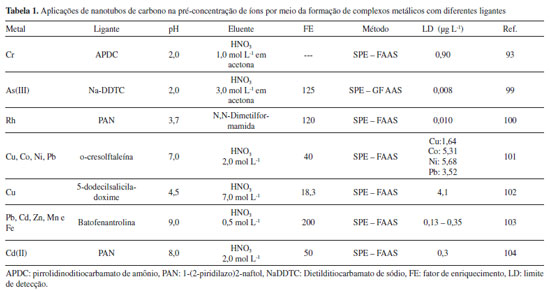 Aplicação de nanotubos de carbono em recentes abordagens de extração em fase sólida na determinação de íons A separação e a pré-concentração de espécies metálicas a partir de amostras líquidas e sólidas também tem sido realizada por modalidades da extração em fase sólida mais recentes,179,180 na qual destacam-se a extração em fase sólida dispersiva (DSPE, Dispersive Solid Phase Extraction), a microextração em fase sólida dispersiva (D-µ-SPE, Dispersive Micro Solid Phase Extraction)181 e a extração em fase sólida magnética (MSPE, Magnetic Solid Phase Extraction).180 Krawczyk e Jeszka-Skowron reportaram o uso de nanotubos de carbono como sorvente para o desenvolvimento de um método baseado em D-µ-SPE para determinação de Cd(II) e Pb(II) em amostras de água com posterior determinação por espectrometria de absorção atômica com forno de grafite e fonte contínua (HR-CS-GAAS, High-resolution Continuum Source Graphite Furnace Atomic Absorption Spectrometry), utilizando amostragem por suspensão do sólido sorvente. O método proposto apresentou baixos limites de detecção, sendo 0,001 µg L-1 e 0,03 µg L-1 para Cd(II) e Pb(II), respectivamente. Cabe ainda ressaltar que a ausência da etapa de eluição na microextração em fase sólida dispersiva, reduz significativamente o tempo de preparo da amostra e a possibilidade de perda do analito e risco de contaminação.182 O emprego de D-µ-SPE usando nanotubos de carbono previamente oxidados como sorventes sólidos e determinação por espectrometria de fluorescência de raio-X com refletância total (TXRF, Total-reflection X-ray Fluorescence Spectrometry) foi proposta por Kocot e demais autores para pré-concentração e determinação de íons Cd(II) e Pb(II) em amostras de águas residuais, de rio e mar. Além da capacidade micro-analítica e de análise simultânea apresentada pela técnica de TXRF, o uso de nanotubos de carbono como sorvente, promoveu rápida sorção dos analitos diminuindo significativamente o tempo de análise. Cabe ainda ressaltar que a escala nanométrica dos nanotubos de carbono permitiu o preparo de uma suspensão representativa a ser analisada pelo TXRF, fato esste atribuído à elevada área de contato dos nanotubos de carbono e a solução contendo os analitos, permitindo alcançar o estado de equilíbrio rapidamente.183 No trabalho realizado por Grijalba et al.,184 em 2015, foi abordada a estratégia de associar D-µ-SPE com nanotubos de carbono e líquido iônico como agente formador de par iônico. O líquido iônico trihexil (tetradecil) cloreto de fosfônio retido na superfície no sorvente foi capaz de pré-concentrar espécies inorgânicas de arsênio em amostras de alho e a determinação foi realizada por amostragem direta do sólido em GF AAS. Os íons metálicos Co(II), Ni(II), Cu(II) e Pb(II) também tem sido determinados por espectrometria de fluorescência de raio-X com energia dispersiva (EDXRF, Energy Dispersive X-ray Fluorescence Spectrometry) após a formação de quelatos metálicos com o APDC e posterior sorção dos complexos na superfície do nanotubos de carbono por D-µ-SPE.185 É interessante ressaltar que tantos os nanotubos de carbono in natura como os oxidados, apresentaram resultados semelhantes em termos de recuperação dos analitos a partir da fase sólida. No entanto, todos os experimentos foram realizados com nanotubos de carbono oxidados, devido a insolubilidade e dificuldade de dispersão apresentada pelos nanotubos de carbono in natura, decorrente das fortes interações de Van der Waals entre as camadas de grafeno, o que leva a uma dispersão não homogênea da fase sólida, prejudicando significativamente a sorção de metais e consequentemente a precisão das análises. Além disso, a combinação da D-µ-SPE e EDXRF, permitiu alcançar limites de detecção iguais a 0,43, 0,11, 0,46 e 0,15 ng mL-1, para Co(II), Ni(II), Cu(II) e Pb(II), respectivamente, utilizando suspensão preparada com apenas 1 mg de nanotubos de carbono. Esse método apresenta vantagens em relação aos procedimentos clássicos de extração em fase sólida, na qual elevados volumes de amostras devem ser utilizados para alcançar baixos limites de detecção. Em estudo similar, Zawisza et al.186 desenvolveram um método de pré-concentração de Cr(II), Mn(II), Fe(II), Co(II), Ni(II), Cu(II), Zn(II) e Pb(II) em nanotubos de carbono paredes múltiplas, seguida da análise de fluorescência de raios-X dispersiva em comprimento de onda. O método proposto apresentou limites de detecção iguais a 0,6; 0,6; 1,0; 0,7; 0,6; 0,5; 0,9 e 1,9 ng mL-1 para os íons Cr(III), Mn(II), Fe(III), Co(II), Ni(II), Cu(II), Zn(II) e Pb(II), respectivamente, empregando uma massa de sorvente preparada por uma suspensão de 5 mg mL-1 de nanotubos de e 100 mL de água ou solução multielementar. Além da microextração em fase sólida, nos últimos anos, o uso de nanopartículas magnéticas, em especial as de tamanho entre 1 - 100 nm, incluindo magnetita (Fe3O4) e a maghemita (γ-Fe2O3), tem recebido especial atenção em microextração em fase sólida magnética (MSPE) para análise de traços e em estudos de especiação, uma vez que estes materiais são facilmente isolados usando um campo magnético mantido fora do recipiente de extração devido à sua natureza superparamagnética. A simplicidade na produção das nanopartículas, aliada a possibilidade de reuso das mesmas, também são consideradas vantagens relevantes desses novos materiais. As nanopartículas magnéticas quando suportadas na matriz de nanotubos de carbono produzem materiais com maior capacidade sortiva e elevada área de superfície. Além disso, podem diminuir significativamente o tempo de extração, pois uma pequena quantidade de sorvente estabelece facilmente um equilíbrio entre a fase sólida e a amostra, mesmo na presença de elevados volumes.187 Nanomateriais carbonáceos magnéticos, obtidos pela combi