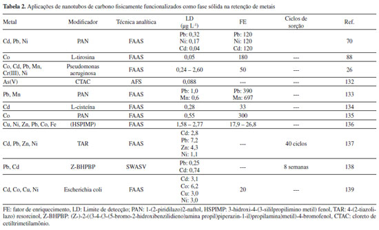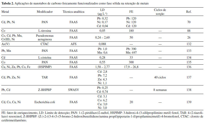 Um dos polímeros mais comuns utilizado para este fim é a quitosana, um polissacarídeo catiônico biodegradável obtido a partir da reação de desacetilação da quitina em meio alcalino. A quitina é um polímero natural composto pelas unidades monoméricas de β-(1→4)-2-amino-2-desoxi-D-glicose e β-(1→4)-2-acetamida-2-desoxi-d-glicose e possui uma estrutura cristalina altamente organizada, comprovada por difração de raio-X. No entanto, embora seja um polímero insolúvel em meio aquoso e na maioria dos solventes, a elevada porcentagem de grupos amino reativos distribuídos em sua matriz polimérica permite sua imobilização nas redes dos nanotubos de carbono e reações de complexação com íons metálicos por meio de interações específicas do grupo amino em sua estrutura.115 O desenvolvimento de materiais modificados química ou fisicamente com quitosana tem sido um campo de pesquisa muito atraente e tem corroborado pelo grande número de publicações científicas e patentes, devido ao grande interesse em aplicações como adsorventes promissores na remoção de íons a partir de diferentes amostras.116-121 Além dos polímeros, tensoativos iônicos e não-iônicos também têm sido utilizados para funcionalizar a superfície dos nanotubos de carbono.105 Os surfactantes usualmente estudados para este fim incluem: (i) surfactantes não - iônicos como o 8-lauril polioxietileno (CH3(CH2)11(OCH2-CH2)7)OCH2CH3),122 etoxilato nonilfenol (Tergitol NP-7),123 octilfenileter polioxietileno (Triton X-100),124,125 (ii) surfactantes aniônicos como, dodecil sulfato de sódio, dodecilbenzenosulfonato de sódio e sulfato de poliestireno126-128 e (iii) surfactantes catiônicos como o brometo de dodeciltrimetilamônio129 e o 4-vinilbenzoato de cetiltrimetilamônio.130 De modo geral, a sorção física de surfactantes na superfície dos nanotubos de carbono aumenta sua solubilidade e dispersabilidade na maioria dos solventes polares comumente utilizados e reduz a tensão superficial do meio, impedindo significativamente a formação de agregados (Figura 3b). O uso do surfactante aniônico, dodecil sulfato de sódio em combinação com nanotubos de carbono de paredes múltiplas foi avaliado para sorção de Ni(II) a partir de águas residuais.131 As moléculas de surfactante uma vez adsorvidas na superfície dos nanotubos de carbono promovem atração entre a parte aniônica da estrutura micelar formada e a carga positiva do íon metálico, favorecendo significativamente a sorção de níquel. Em outro trabalho, nanotubos de carbono recobertos por hemimicelas do surfactante catiônico cloreto de cetiltrimetilamônio (CTAC) como fase sólida foram empregados para pré-concentração de As(V) em águas ambientais. Nesse trabalho, a preparação do sorvente envolveu a oxidação prévia dos nanotubos de carbono e posterior adição do surfactante na matriz carbonácea. A sorção pode ser atribuída à interação eletrostática entre as espécies negativamente carregadas de As (V), H2AsO4- (5< pH <6) e os agregados de hemimicelas do CTAC positivamente carregados, sendo esta decorrente da presença de grupos funcionais contendo oxigênio na superfície dos nanotubos de carbono e a cadeia alquil catiônica do CTAC.132 O outro método não-covalente para funcionalização de nanotubos de carbono é o método conhecido como endohedral. Embora esse método consista no armazenamento de átomos, tais como, partículas inorgânicas de Ag, Au e Pt ou moléculas (aminoácidos, proteínas e DNA, entre outras) nos defeitos localizados nas extremidades dos tubos ou nas paredes laterais por efeito capilar (Figura 3c), os materiais obtidos por esse tipo de funcionalização não encontram aplicação analítica na remoção de metais.105 A Tabela 2 apresenta alguns exemplos de aplicação dos nanotubos de carbono multiparedes impregnados com diferentes modificadores na determinação de íons metálicos em diversas matrizes amostrais e técnicas analíticas.