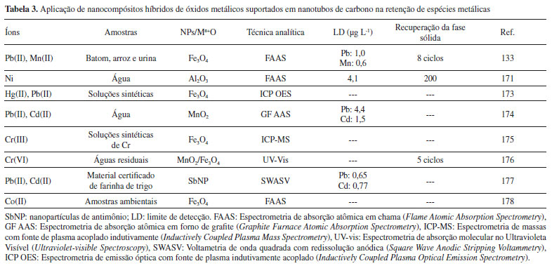 Em Ghaedi et al.,136 nanotubos de carbono multicamadas foram quimicamente modificados por uma base de Schiff (3-hidroxi-4-((3-sililpropilimino)metil)fenol) (HSPIMP) e, posteriormente, aplicado como fase extratora de Cu(II), Ni(II), Zn(II), Pb(II), Co(II) e Fe(II) em diferentes amostras alimentícias. Como parâmetros analíticos obtidos cita-se o elevado fator de pré-concentração (267 vezes), baixos limites de detecção (1,58 - 2,77 µg L-1) e capacidade sortiva de 30 mg g-1, em face da elevada capacidade de complexação e formação de quelatos dos grupos funcionais OH e N presentes no reagente modificador. Ainda, nanotubos de carbono covalentemente funcionalizados com ácido iminodiacético (IDA) foram utilizados como fase extratora na determinação simultânea de V(V), Cr(VI), Pb(II), Cd(II), Co(II), Cu(II) e As(III) usando um sistema de injeção em fluxo acoplado ao ICP-MS.162 Hadavifar e demais autores avaliaram a eficiência da funcionalização de nanotubos de carbono de paredes múltiplas por meio da introdução de grupos funcionais amino (etilenodiamina) e tiol (2-mercaptoetanol de sódio) nas paredes laterais dos nanotubos, na pré-concentração de íons Hg(II) e Cd(II), de forma individual e simultânea, a partir de soluções aquosas. A capacidade sortiva do material resultante (MWCNTs-SH) foi avaliada com base na sorção competitiva dos íons em sistemas individuais e binários. O material sorvente, (MWCNTs-SH) apresentou maior afinidade para sorção de Hg(II) (204,64 mg g-1) quando comparado ao Cd(II) (61,10 mg g-1) tanto em soluções individuais como em sistemas binários. Esse resultado pode ser explicado em face do Hg ser um ácido macio, segundo a Teoria de Pearson, com elevada tendência em formar fortes ligações covalentes com grupos -CN, -RS, -SH e NH2. No entanto, a maioria das espécies de Cd(II) encontradas na forma de complexo hexahidratado - [Cd(H2O)6]2+, apresentam um processo endotérmico com energia de ativação para remoção das moléculas de água, desfavorecendo assim a sorção de Cd(II) no sorvente.163 Os nanotubos de carbono quimicamente modificados também têm apresentado potencialidades em estudos de especiação química. Em 2015, Peng et al.164 empregaram nanotubos de carbono funcionalizado com 3-(2-aminoetilamino) propiltrimetoxisilano (AAPTS) como fase extratora para especiação inorgânica simultânea de As, Se e Cr em amostras de água de chuva, rios e lagos. O diferente comportamento sortivo das espécies de As(V), Se(VI) e Cr(VI) no NTC-AAPTS pode ser explicado pelos seus respectivos valores de pKa e pelo caráter iônico das espécies. Além disso, a forte interação entre as espécies aniônicas e a base mole -NHCH2CH2NH2- tornou possível a separação simultânea das espécies em uma estreita faixa de pH. Assim, em pH 2,2 foi possível realizar a especiação de As(V), Cr(VI) e Se(VI) de As(III), Se(IV) e Cr(III). Além da satisfatória seletividade apresentada pelo sorvente, outras características como boa estabilidade sob condições ácidas, rápida cinética de sorção e dessorção e elevada tolerância a íons interferentes foram observadas. Embora tenha sido desenvolvido utilizando ICP-MS, o método apresentou baixo custo de reagentes e rapidez nas análises, podendo ser utilizado em análises de rotina de amostras de água. Outros exemplos de aplicação de nanotubos de carbono funcionalizados quimicamente e usados como fase extratora na determinação de diversos íons metálicos foram reportados em Gil et al.93,165,166 e Tuzen e Soylak, Zang et al.167 Ademais, outros agentes modificadores como DMABRH (5-(4-dimetilaminobenzilideno)-rodanina),157 NBHAE (N,N'-bis(2-hidroxibenzilideno)-2,2'(aminofeniltio)etano,70 mistura de reagentes sólidos e líquidos (D2EHPA (Di-(2-etilhexil)ácido fosfórico) e TOPO (óxido de tri-n-octilfosfina)) também tem sido quimicamente ligados à superfície dos nanotubos oxidados. Em um estudo pioneiro, a imobilização química de proteínas em nanotubos de carbono tem sido uma estratégia interessante para preparar sorventes capazes de pré-concentrar íons metálicos e, ao mesmo tempo, evitar a sorção irreversível de proteínas provenientes de fluidos biológicos.168,169 Nestes trabalhos, Barbosa et al.168 imobilizaram BSA (Bovine serum albumin) sobre nanotubos de carbono oxidados para obter nanotubos de carbono com acesso restrito (RACNT, restricted access carbon nanotubes). Os autores confirmaram a imobilização da BSA e a presença de sítios de adsorção de íons Pb(II) e Cd(II) empregando as técnicas de microscopia eletrônica de transmissão de alta resolução (HRTEM, High-Resolution Transmission Electron Microscopy), microscopia eletrônica de varredura (MEV ou SEM, Scanning Electron Microscope) e espectroscopia de raios-X por dispersão de energia. O RACNT apresentou capacidade para extrair íons Pb(II) e Cd(II) e excluir 100,0% das proteínas séricas diretamente do soro de sangue humano sem empregar etapas de pré-tratamento. Além da modificação química da superfície de nanotubos de carbono pelos mais diversos tipos de agentes quelantes, proteínas e reagentes organosilanos, alguns estudos têm reportado o uso de nanocompósitos híbridos de óxidos metálicos suportados em nanotubos de carbono como sorventes potenciais em extração em fase sólida (Tabela 3). Dentre os óxidos metálicos utilizados para este fim destacam-se CeO2,170 Al2O3,171 Fe3O4,172,173 e MnO2.174 A presença de óxidos metálicos altamente dispersos em monocamadas na matriz carbonácea faz com que o nanocompósito exiba propriedades anfotéricas devido à presença de sítios de ligação ácido/base de Lewis e Bronsted, na qual promove maior seletividade em relação aos íons metálicos em ampla faixa de pH. Ainda, esses materiais apresentam elevada capacidade sortiva, área superficial e resistência mecânica quando submetidos a sistemas de pré-concentração em fluxo à elevadas 