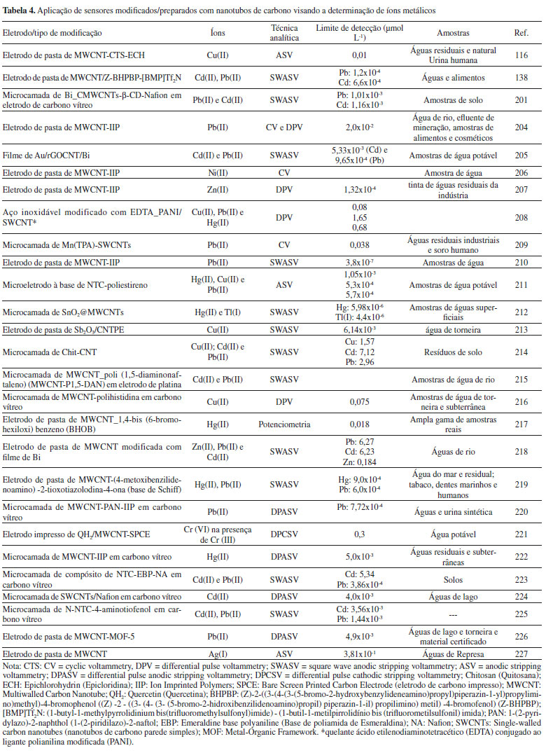 Um método simples para determinação simultânea de Zn(II), Cd(II) e Pb(II) em amostras de águas ambientais usando eletrodo de pasta de nanotubo de carbono e monitoramento por análise potenciométrica de redissolução foi descrita por Tarley et al.203 As medidas potenciométricas foram realizadas na presença de Hg(II) 15 mg L-1, uma vez que este auxilia não somente na oxidação dos analitos na etapa de redissolução, como também exerce papel fundamental na formação de um filme metálico na superfície do eletrodo de pasta de carbono, aumentando significativamente a eficiência de deposição dos íons. Dentre as vantagens apresentadas pelo método proposto destacam-se a fácil construção do eletrodo, reprodutibilidade nas medidas simultâneas (< 7,2% para n=5), em tempo reduzido de análise (3 minutos), além do baixo custo de operação.203 Determinações voltamétricas simultâneas de íons metálicos, utilizando diferentes eletrodos de nanotubos de carbono modificados com filme de bismuto, base de Shiff e filme de mercúrio também foram descritas por Afkhami et al.,138 Hwang et al.218 e Prabakar et al.228 Um método voltamétrico foi reportado por Vicentini e demais autores para determinação de Pb(II) em águas naturais usando eletrodos de pasta de nanotubos de carbono modificados com quitosana reticulada com glutaraldeído e voltametria de onda quadrada por redissolução anódica.117 Apesar do uso de quitosana para extração/retenção de cátions metálicos como Hg(II), Cd(II) e Cu(II)116,120 em amostras de água ser reconhecido, devido sua elevada força mecânica, boa aderência em superfícies eletroquímicas e biocompatibilidade, seu desempenho eletroquímico pode ser melhorado quando glutaraldeídos são reticulados em sua matriz.229 A presença do agente reticulador aumenta o número de grupos hidroxila ou amino na matriz de quitosana, favorecendo a sorção de cátions metálicos na superfície do eletrodo. O desempenho satisfatório do eletrodo foi atribuído à quitosana reticulada, que levou a um aumento de duas vezes na corrente de pico quando comparado ao eletrodo de pasta de carbono com quitosana sem a reticulação. O método desenvolvido apresentou satisfatória resposta analítica para determinação de Pb(II) em águas naturais sem efeito de matriz e baixo limite de detecção (5,70 × 10-8 mol L-1) quando comparados a outros métodos.117 No trabalho reportado por Liang et al.,230 um sensor eletroquímico foi preparado a partir de nanotubos de carbono modificados com ácido fítico para determinação de íons Cu(II). O sensor proposto apresentou satisfatória sensibilidade e sensibilidade na determinação de traços de Cu(II) em amostras de água de rio, devido à maior habilidade do ácido fítico em formar complexos estáveis com íons Cu(II), na presença de íons divalentes como Zn(II), Co(II), Mn(II), Fe(II) e Ca(II). Em outro trabalho, Janegitz et al.,116 em 2009, desenvolveram e aplicaram um eletrodo de pasta de carbono funcionalizado com quitosana modificada com epicloridrina para determinação de Cu(II) em águas industriais, naturais e amostra de urina por voltametria de redissolução anódica. De acordo com os resultados obtidos, a modificação da quitosana através da reticulação com epicloridrina e a posterior impregnação nas camadas de nanotubos de carbono foram responsáveis pela maior sorção de íons Cu(II) e, consequentemente, pelo aumento na resposta de corrente. Além do preparo do eletrodo ser considerado de fácil execução, consistindo na mistura de nanotubos de carbono com quitosana reticulada e óleo mineral, um limite de detecção igual a 1,00 × 10-8 mol L-1 foi obtido, sem qualquer etapa de desaeração da solução. A associação de líquidos iônicos e nanotubos de carbono tem sido utilizada com sucesso na confecção de sensores voltamétricos para determinação de íons metálicos, conforme descrito por Bagheri e demais autores.231 Neste estudo, MWCNT modificados com trifenilfosfina e líquidos iônicos foram empregados para determinação simultânea de Cd(II), Pb(II) e Hg(II). Os líquidos iônicos têm sido propostos como ligantes orgânicos, bem como aglutinantes eficientes em substituição àqueles não condutores comumente usados no preparo de eletrodos compósitos de carbono, tais como parafina e Nujol®. Além de elevada condutividade, baixa pressão de vapor, propriedades de troca-iônica, os líquidos iônicos apresentam são não eletroativos num amplo intervalo de potencial, rápida cinética de transferência de elétrons e excelente estabilidade química e física. Adicionalmente, a combinação de tais materiais com ligantes específicos como a trifenilfosfina (PPh3) proporcionam excelentes plataformas eletroquímicas para determinação de íons metálicos devido à combinação das fortes propriedades sortivas dos nanotubos de carbono e da capacidade de complexação específica do ligante. A partir dos resultados foi possível notar um aumento acentuado na corrente de pico para Cd(II), Pb(II) e Hg(II) quando eletrodos na presença de MWCNT/LI/PPh3 foram utilizados na pré-concentração dos íons. Embora a presença de líquido iônico aumente de forma eficaz as taxas de pré-concentração dos metais na superfície dos eletrodos, o aumento da área de contato e a diminuição da resistência interfacial se deve pela adição de MWCNT nos eletrodos de pasta de carbono. Outros trabalhos têm sido reportados na literatura a respeito do emprego de nanotubos de carbono modificados com diferentes ligantes, tais como azocompostos, (1-piridilazonaftol - PAN), corantes, polímeros ionicamente impressos, 2-aminotiofenol e tetraquis(p-clorofenil) borato de potássio, trimetoxissililpropilmetilendiamina (TMSPEDA) e 2-hidroxibenzaldeo (2-HBA), 4- [1- (4-metoxifenil) metilideno] -3-metil-5-isoxazolona, entre outros. Nestes trabalhos, ganhos substanciais na sensibilidade do método foram obtidos 
