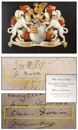 ![]() Figure 1. The crest of the Royal Society of London (©The Royal Society) bearing the motto 'Nullius in verba', together with an extract from the Charter Book signed by newly-elected fellows, and examples for Isaac Newton (1672) and Charles Darwin (1839). Even today, Fellows sign the book using a quill pen and black ink. Currently there are about 1,600 Fellows and Foreign Members; 52 Fellows and up to 10 Foreign Members are elected each year. Newton discovered the laws of gravity and motion, and invented calculus. Darwin's proposition that all living species have descended from common ancestors is now a fundamental scientific concept. After publication of his book "On the Origin of Species" in 1859, it took several decades before his views on natural selection as the basis of evolution were accepted. The crest is reproduced with permission from The Royal Society