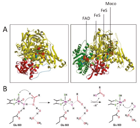 ![]() Figure 3. A) Xanthine oxidase (in right) contains four redox centers: Moco (the pterin cofactor is a molybdopterin cytosine dinucleotide), two (2Fe-2S) centers and a FAD moiety, while aldehyde oxido-reductase (in left) has strong analogies with Xanthine oxidase and the polypeptide chain folds into four domains: two bind the iron sulfur clusters and the others are associated with Moco. The additional domain (in green), that binds FAD in xanthine oxidase, is absent in Dg Aldehyde oxido-reductase (does not contain a flavin moiety), although it was recognized that a small flavodoxin participates in electron transfer instead. B) shows a proposed mechanism for the conversion of aldehydes in carboxylic acids based on Dg Aldehyde oxido-reductase structural studies (see text)76,94,95