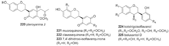 ![]() Figura 3. Fórmulas estruturais de isoflavana (220), isoflavanquinonas (221-223) e isoflavan-4-ols (224-225)