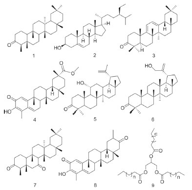 ![]() Figure 1. Chemical structures of compounds 1 to 9 from hexane and chloroform extracts of the Maytenus distichophylla roots