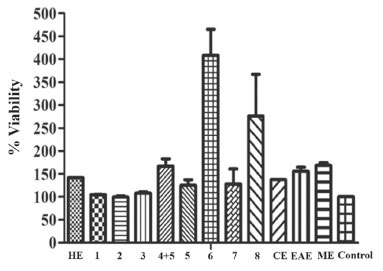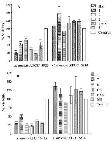 ![]() Figure 2. Percent viability of S. aureus MRSA (ATCC 25923) and C. albicans (ATCC SC5314) treated with substances from Maytenus distichophylla roots. A) HE = hexane extract, 1 = friedelan-3-one, 2 = β-sitosterol, 3 = 3-oxoolean- 9(11),12-diene, 4+5 = [(mixture of pristimerin (4) + rigidenol (5)], 5 = Rigidenol. B) 6 = 30-hydroxylup-20(29)-en-3-one, 7 = friedelane-3,7- dione, 8 = tingenone, CE = chloroform, EAE = ethyl acetate and ME = methanol extracts. DMSO = positive control