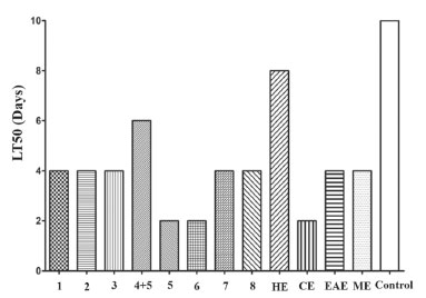 ![]() Figure 4. Median lethal time (LT50) determined after exposure of C. elegans to compounds and extracts from Maytenus distichophylla roots. 1 = friedelan- 3-one, 2 = β-sitosterol, 3 = 3-oxo-olean-9(11),12-diene, 4+5 = [(mixture of pristimerin (4) + rigidenol (5)], 5 = rigidenol, 6 = 30-hydroxylup-20(29)-en-3- one, 7 = friedelane-3,7-dione, 8 = tingenone. HE = hexane, CE = chloroform, EAE = ethyl acetate and ME = methanol extracts. DMSO = positive Control