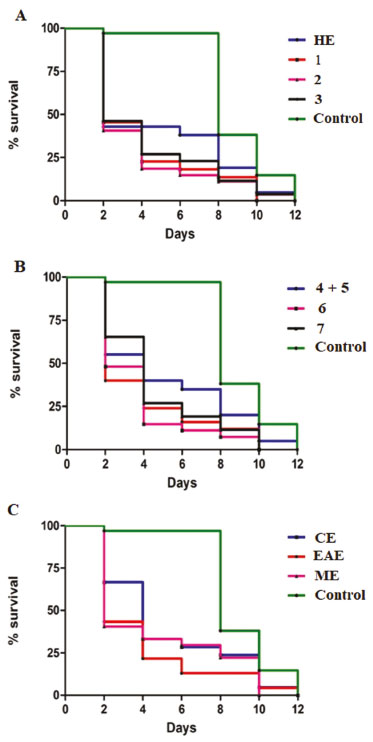In the chronic trials, adult (L4) C. elegans were used to verify if toxic effects are induced by the samples of M. distichophylla, after an exposure time. Thus, survival curves of C. elegans (L4 larvae) normally fed with E. coli OP50 and in the presence of samples at the maximum concentration tested were established (Figure 5). It was observed that all extracts and compounds, after a chronic exposure, reduced significantly the C. elegans (L4 larvae) survival (Figure 5). ![]() Figure 5. Effect on the C. elegans survival, after treatment with extracts and compounds from M. distichophylla roots. 1 = friedelan-3-one, 2 = β-sitosterol, 3 = 3-oxo-olean-9(11),12-diene, 4+5 = [(mixture of pristimerin (4) + rigidenol (5)], 5 = rigidenol, 6 = 30-hydroxylup-20(29)-en-3-one, 7 = friedelane-3,7- dione, 8 = tingenone. HE = hexane, CE = chloroform, EAE = ethyl acetate and ME = methanol extracts. DMSO = positive control