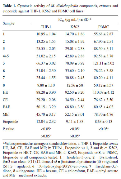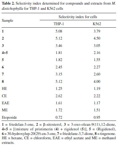 Activity against S. aureus MRSA was observed at maximal tested concentrations and all samples demonstrating significant activity against S. aureus (Figure 2). The HE and CE extracts induced greater activity than ethyl acetate (EAE) and methanol (ME) extracts. HE and the mixture of 4 and 5 (Figure 2A), CE extract, compound 5 and 8 (Figure 2B) were the most active samples reducing 75% of S. aureus viability. Compounds 4 and 5 were isolated from HE and CE extracts, respectively. The HE and CE extracts induced greater activity than ethyl acetate (EAE) and methanol (ME) extracts. These results may be associated with the presence of pentacyclic triterpenes in the HE and CE extracts, for which antibacterial activity has been reported.10 Tingenone (8) isolated from CE extract induced similar activity to CE extract suggesting that the activity of this crude extract may be associated with the presence of 8 (Figure 2B). There was no significant difference in S. aureus susceptibility between the more active compounds (Figure 2). Thus, the more active samples can be considered as potential candidates for in vivo assays involving S. aureus infections aiming to establish its efficacy. Cytotoxicity evaluation Due to the demand for new resources against diseases that involve complicated, invasive, and expensive treatments such as anti-carcinogenic64 or antiretroviral62 agents, different compounds from plants have been used as a starting point for development of new drugs with social and economic potential. In this context, the cytotoxic activities of compounds and extracts from M. distichophylla roots were evaluated against leukemic cells through the IC50 value calculated by the MTT assay. The samples exhibited in vitro cytotoxicity against K562 chronic myeloid leukemia cells (1: 14.70 µg mL-1; 2: 15.08 µg mL-1; and 8: 12.56 µg mL-1) and THP-1 acute leukemic cell lines (1: 10.95 µg mL-1; 2: 13.25 µg mL-1; and 8: 9.80 µg mL-1) (Table 1). According to the results, the cytotoxic activities of compounds 1, 2 and 8 induced activity against the THP-1 cell, similar to etoposide, which is an inhibitor of DNA synthesis that acts through stabilization of type II topoisomerase-DNA complexes, preventing joining of single- and double-strand DNA breaks.65,66 On the other hand, the compound 8 showed similar cytotoxic activity (p > 0.05) to that of the etoposide in the K562 line (Table 1).